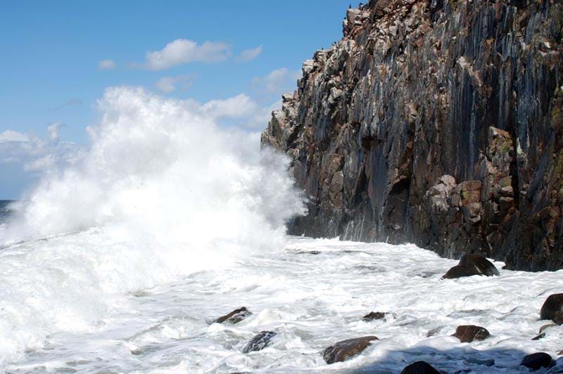 Og for foden af de lodretstående og stærkt opspaltede kystklipper ligger en betragtelig mængde i "nyere tid" frostsprængte klippeblokke i en vanskelig passerbar ur.