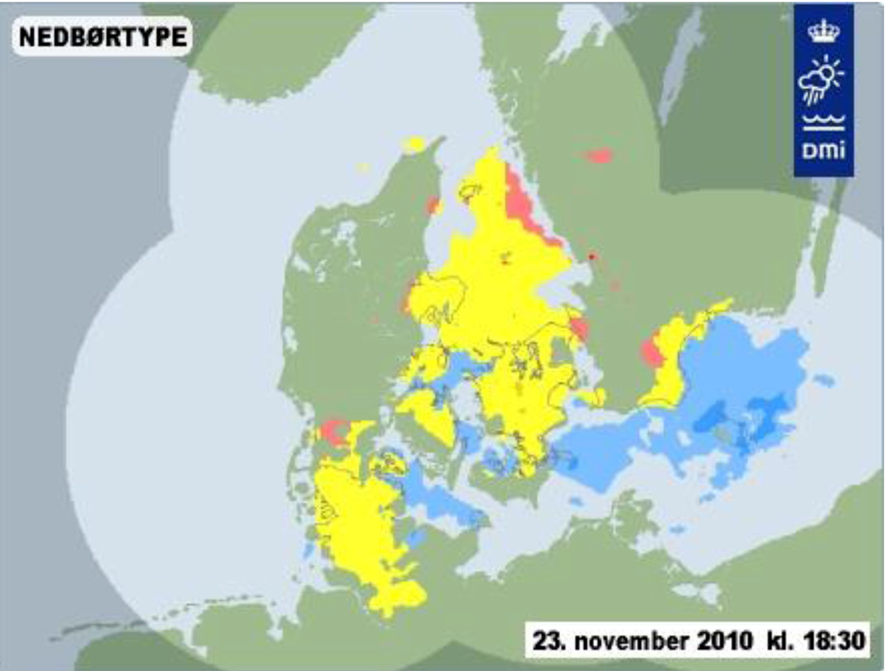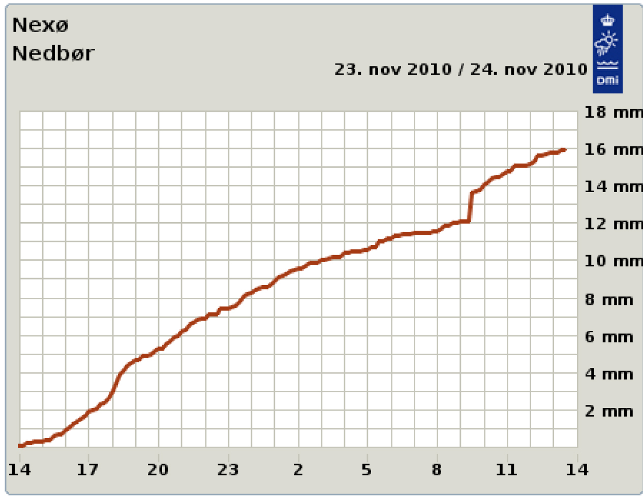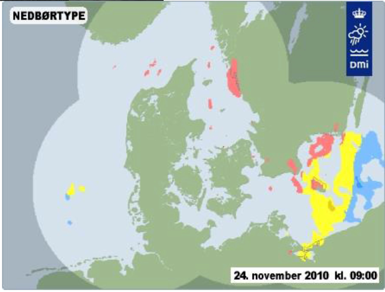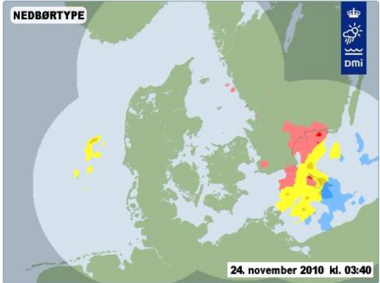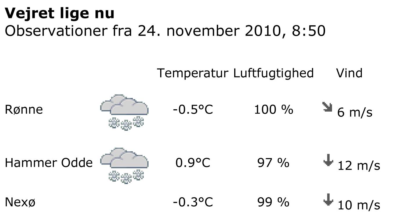 Nedbøren skiftede fra regn til slud og sne tidligt om morgenen onsdag den 24. november, og denne sne lagde sig som store tæpper på alt, hvad der ragede op og som hurtigt kunne køles af – således træerne på det højtliggende Bornholm.