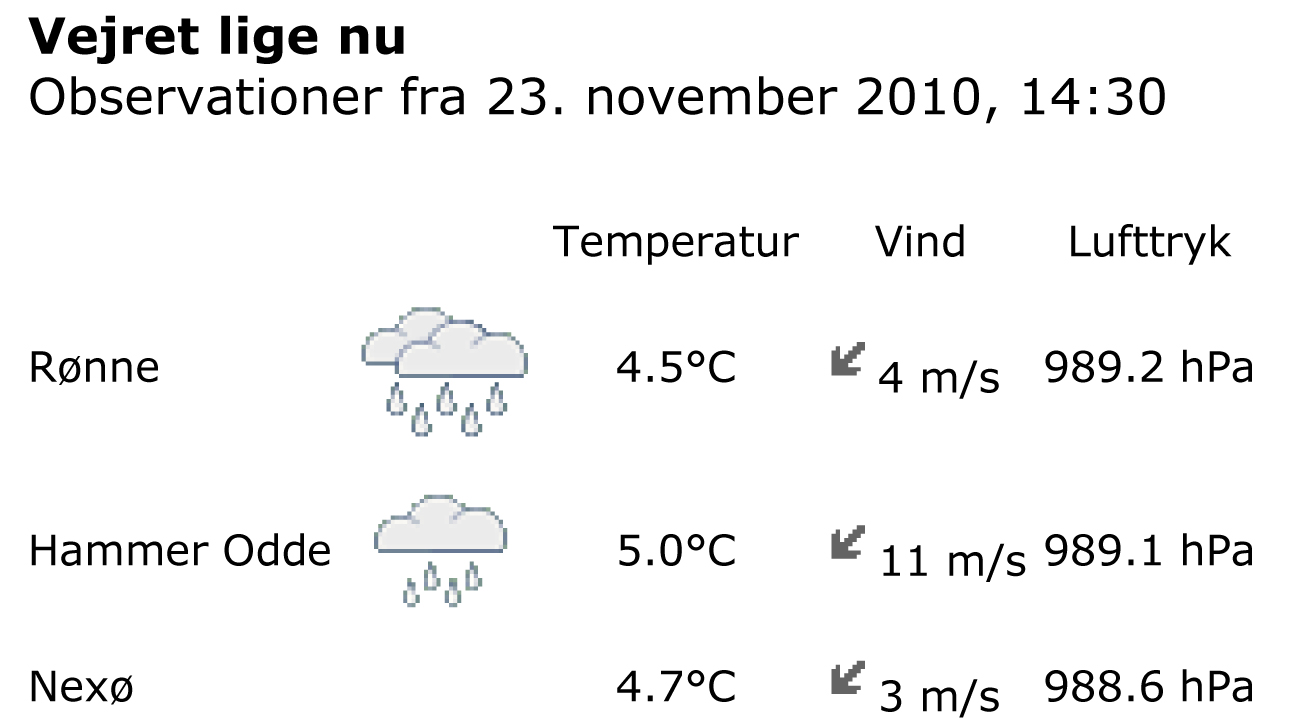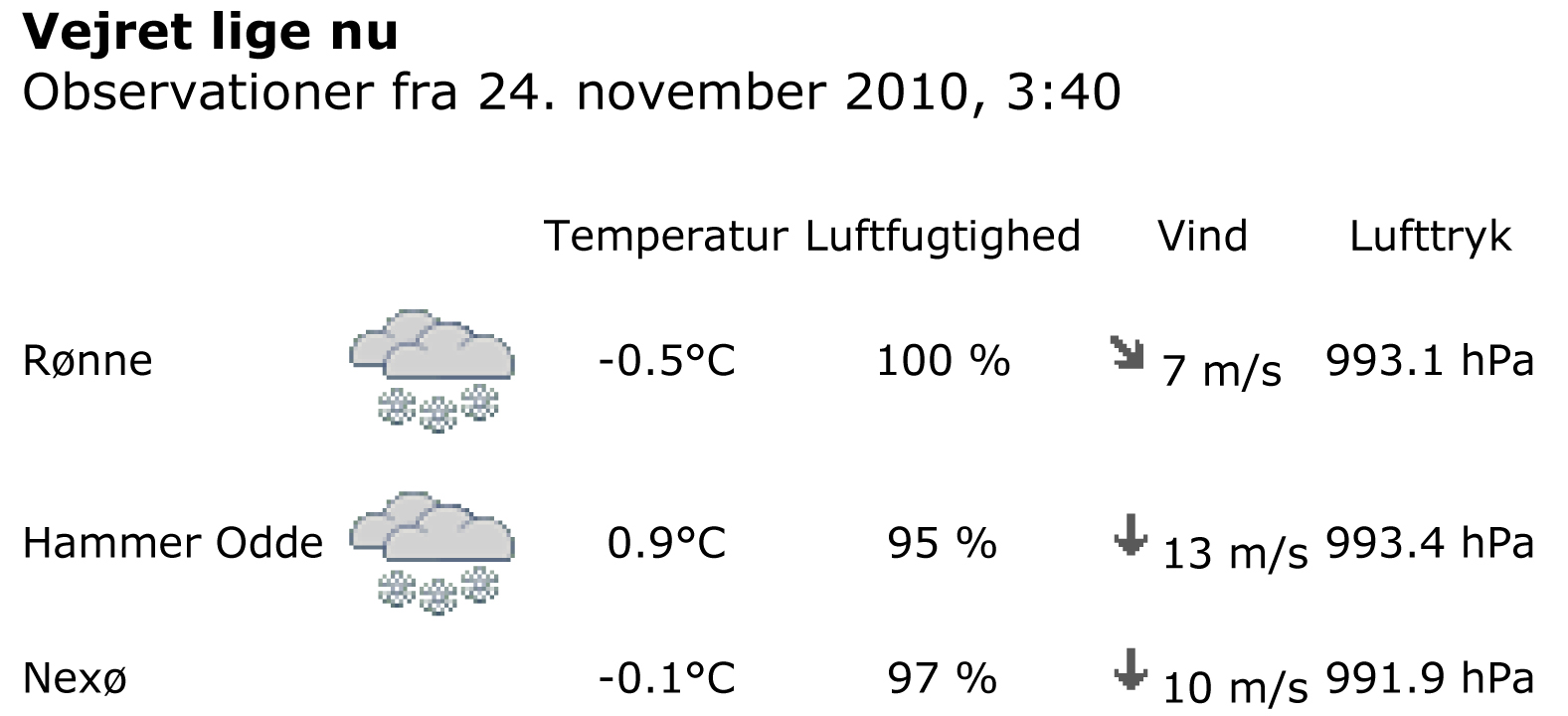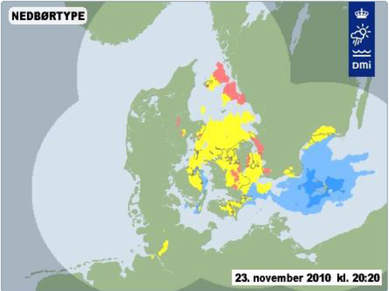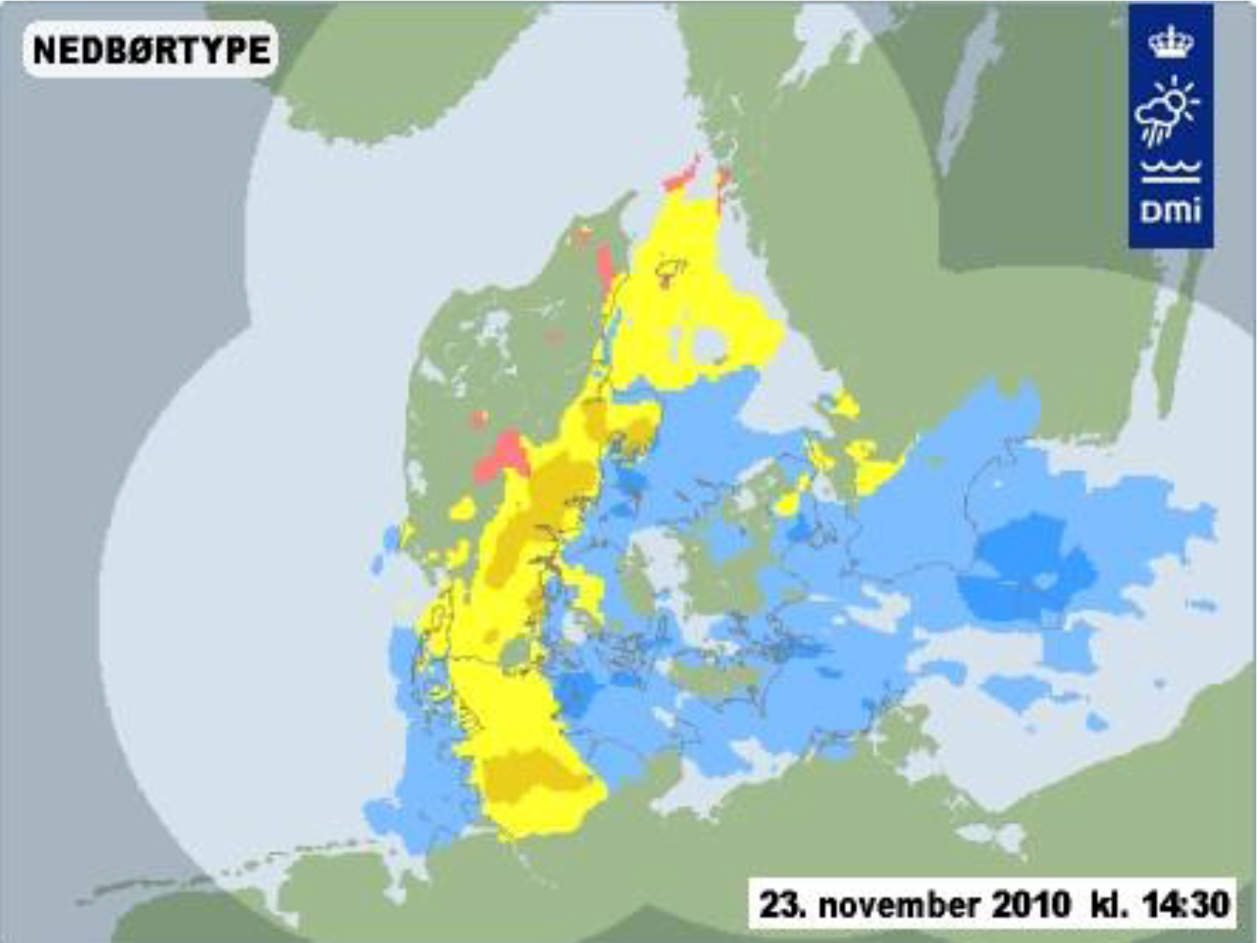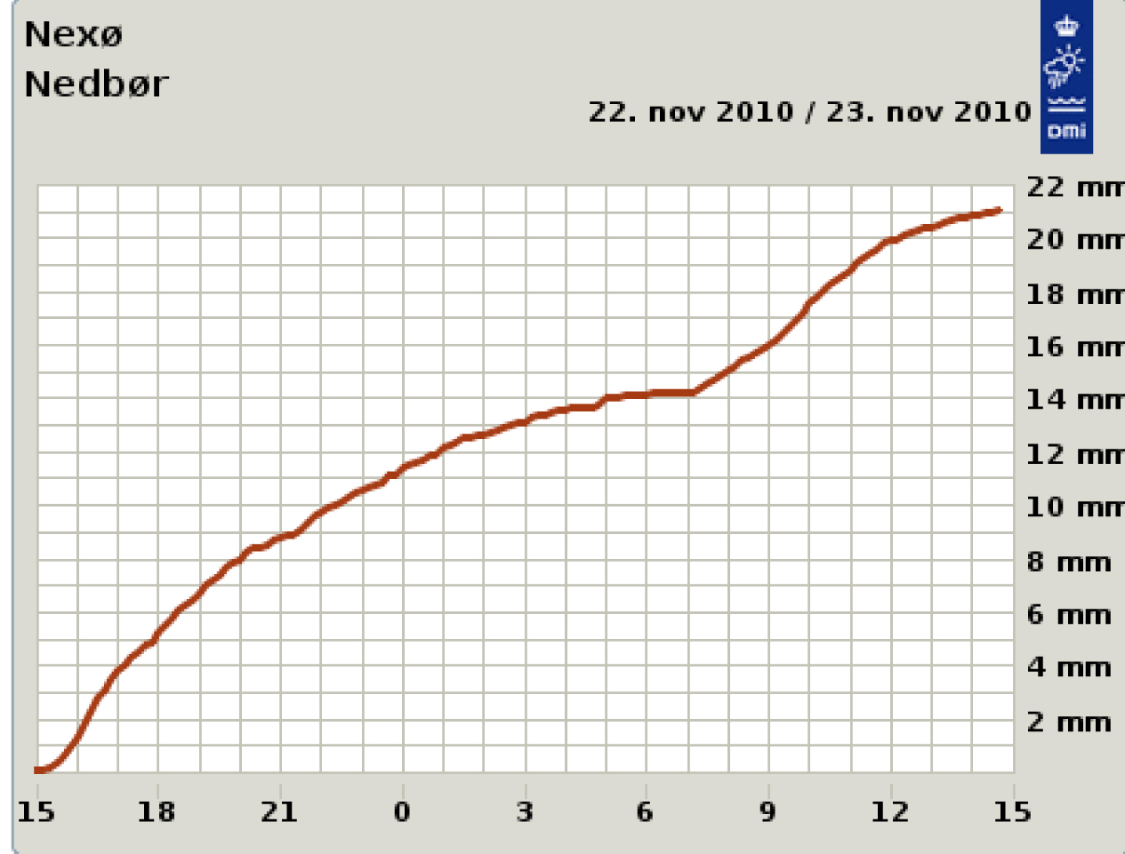Nedbøren skiftede fra regn til slud og sne tidligt om morgenen onsdag den 24. november, og denne sne lagde sig som store tæpper på alt, hvad der ragede op og som hurtigt kunne køles af – således træerne på det højtliggende Bornholm.