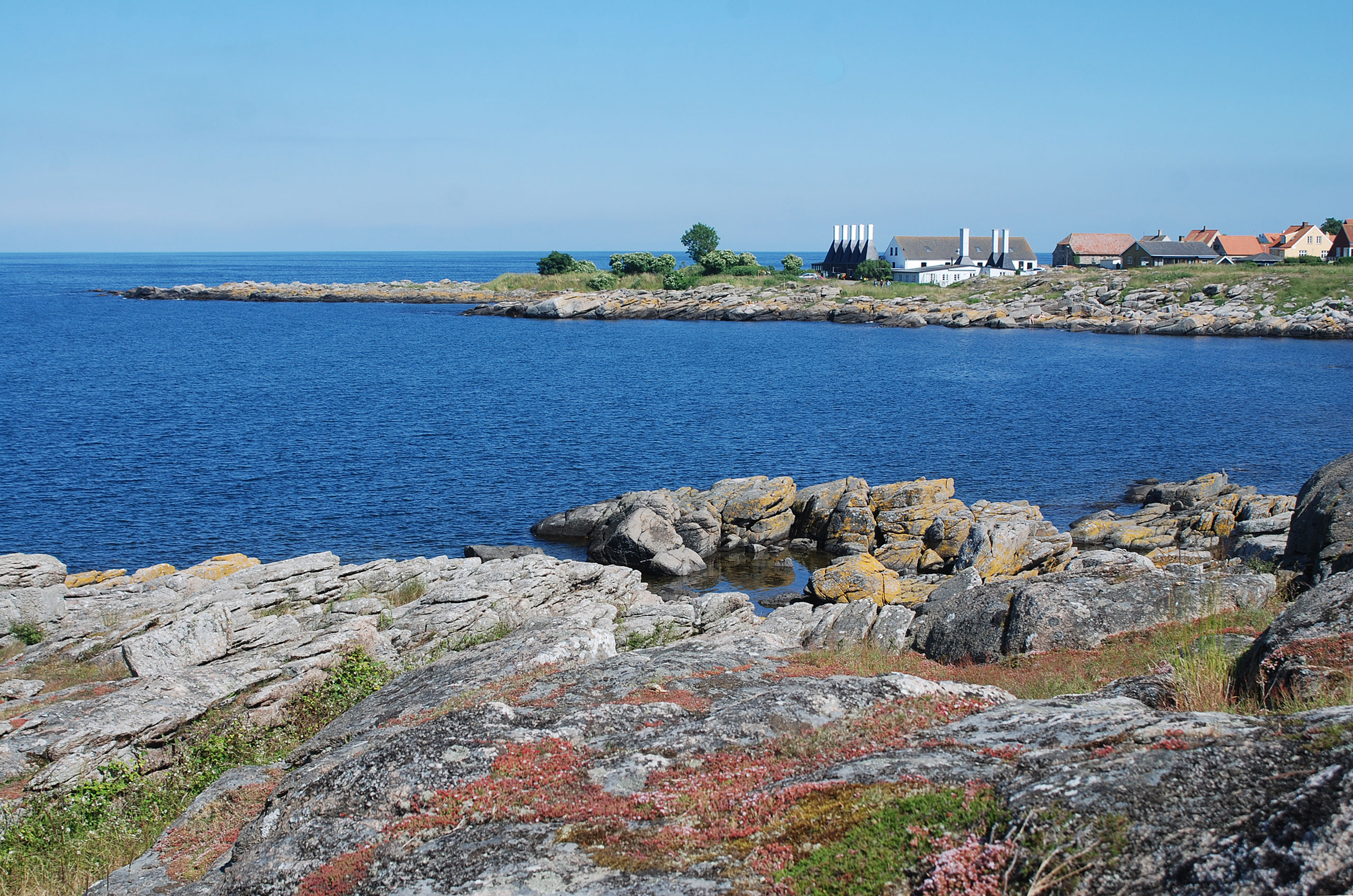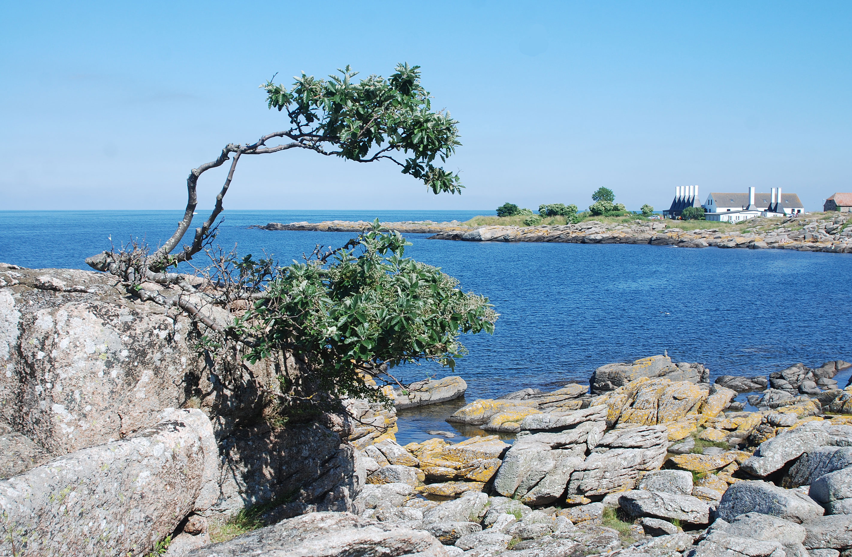 I baggrunden ser man ligeledes, at en stejl vanderoderet kystskrænt har et fremragende grundfjeld, afrundet af vandets erosion samt en kraftig tilgroning af især tjørn?
