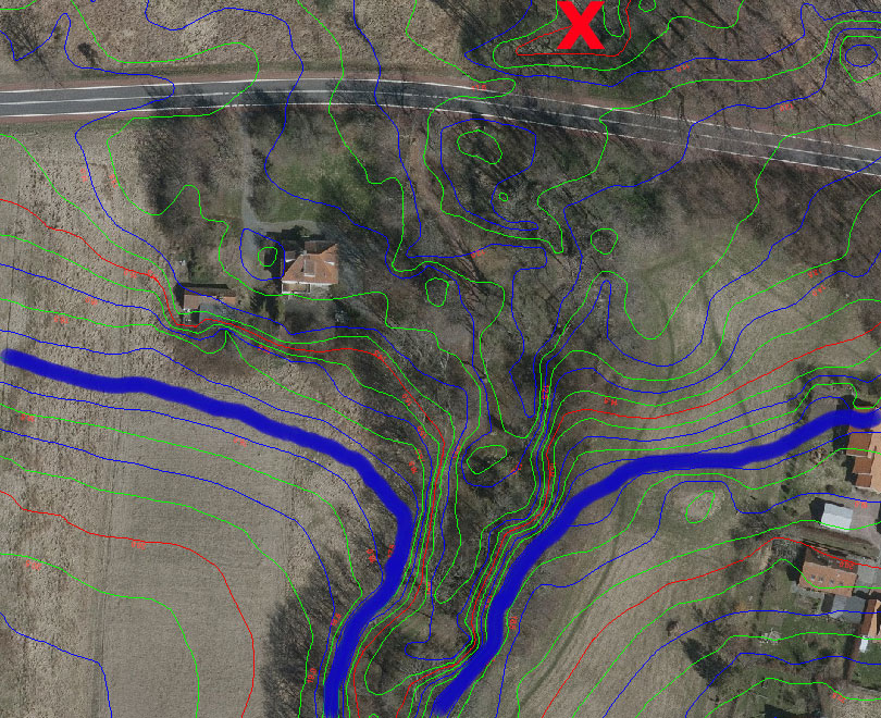 På vedhæftede luftfoto med højdekurver er 17,5 meter kurven, der skulle være datidens kystlinie, fremhævet med blåt, og Myhres trefod og apparat fra billedet med et rødt kryds.
