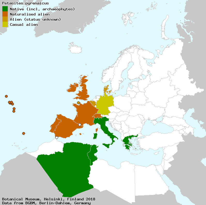 Det er Vellugtende/Duftende Hestehov, og ja, det er artens eneste voksesteder i hele Skandinavien, og som andre repræsentanter i denne planteslægt kommer blomsterne frem længe før bladene, nogle år allerede sidst i oktober, andre år i november, december og januar-februar.
