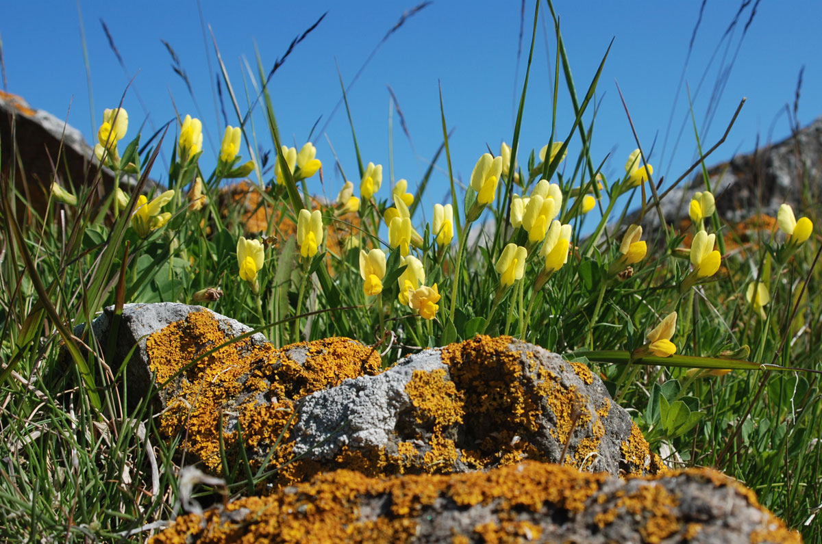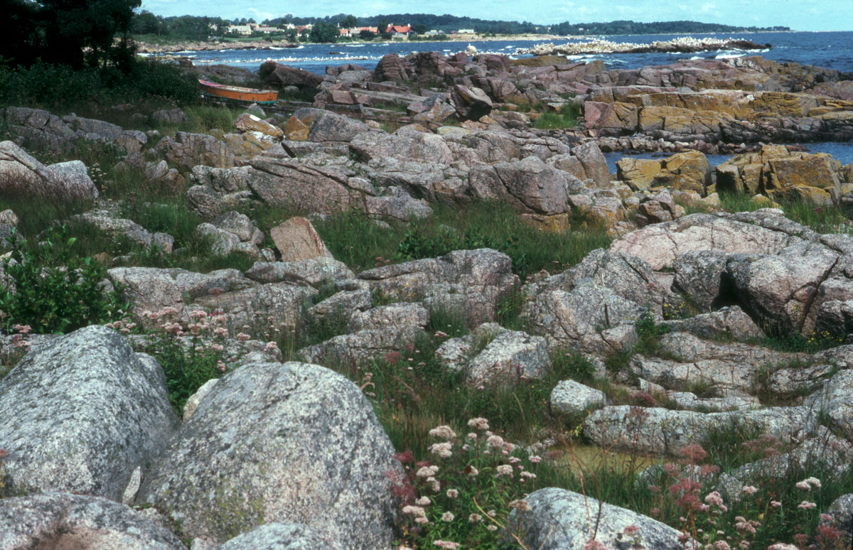 Kantbælg og græsset Blåtop på de små strandenge langs klippekysten