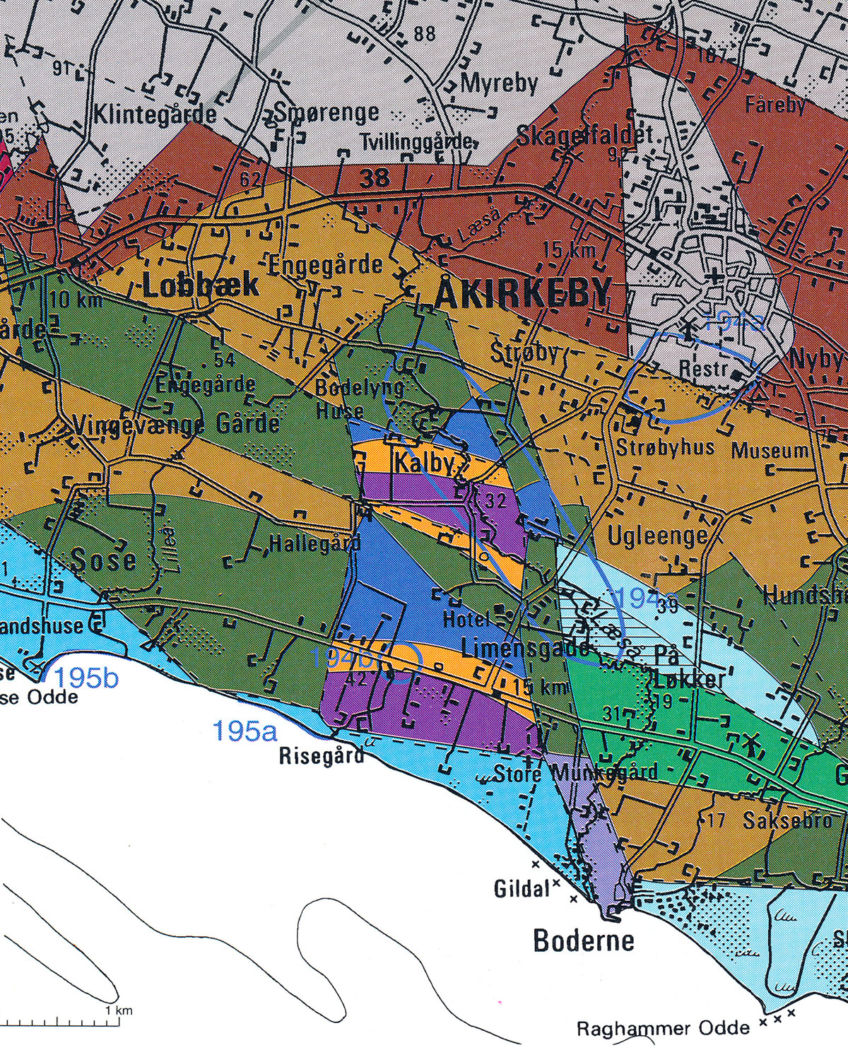 Omstående kort fra "Geologisk set Bornholm" viser, hvordan aflejringerne findes på små blokke afgrænset af forkastningslinier.
