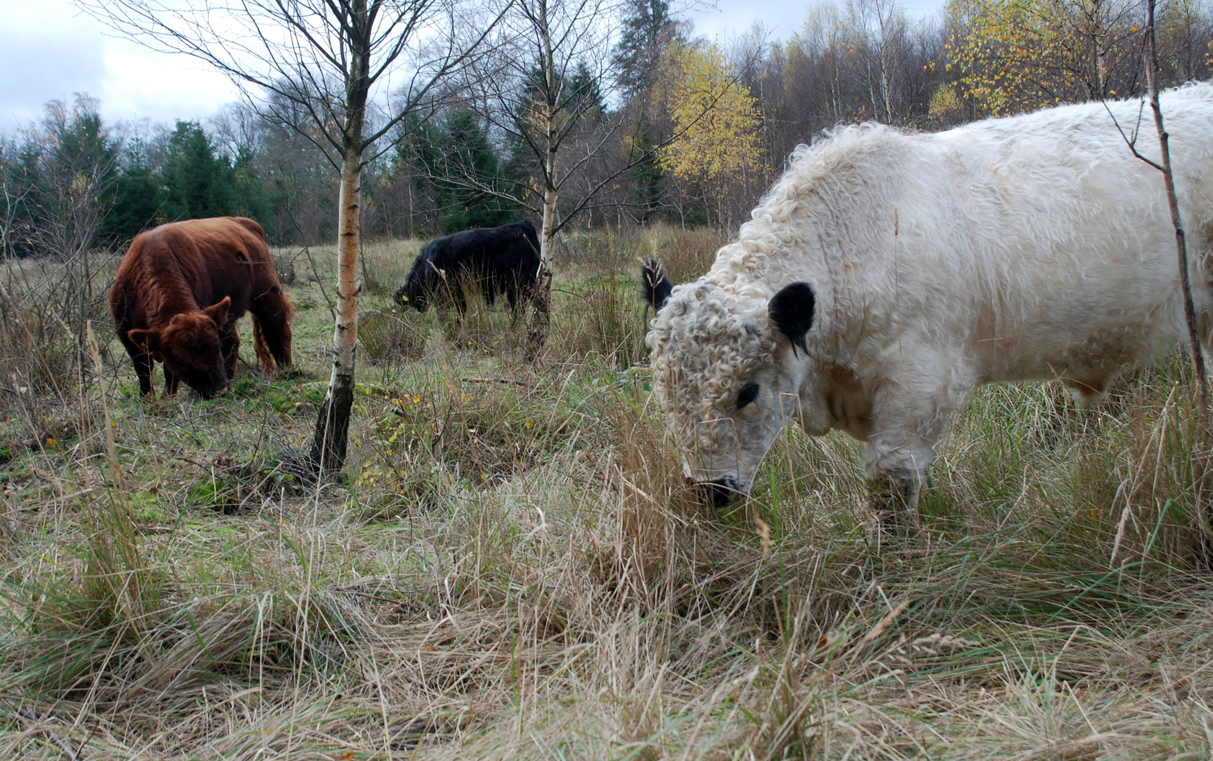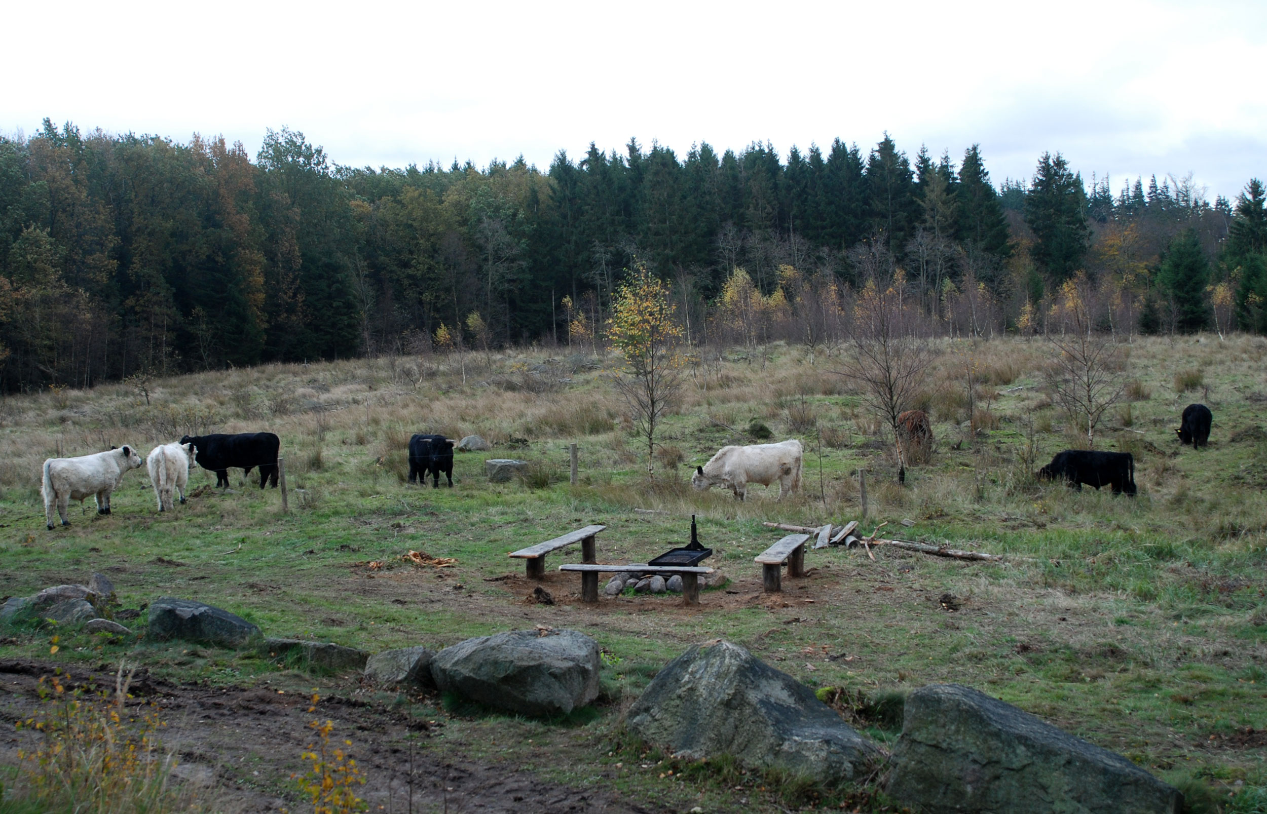 Kreaturer afgræsser et tidligere højlyngsareal for foden af Højemosebakkeshelterne