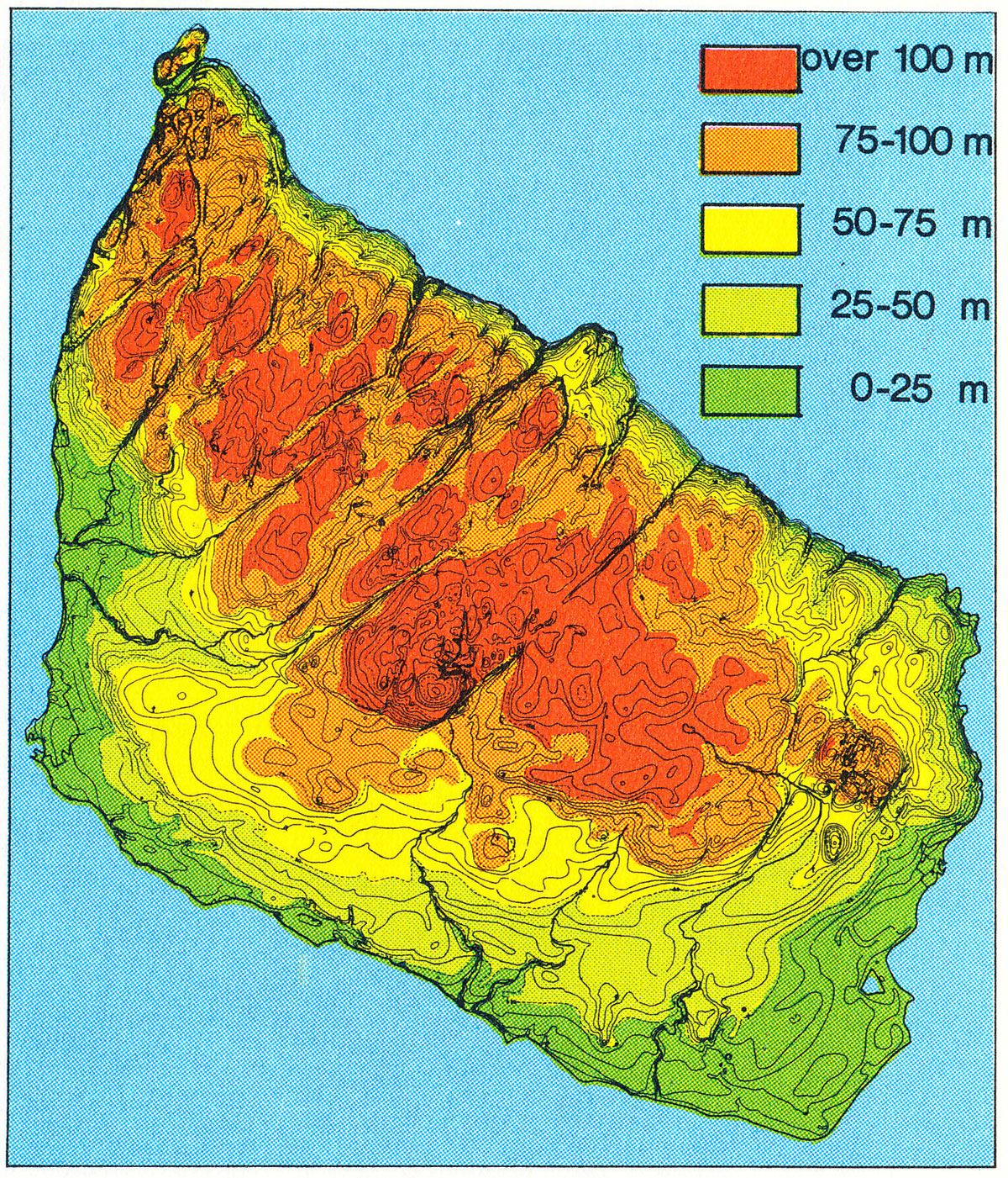 Kigger man på et kort og finder alle stednavne, der indikerer en forhøjning i det landskab, Almindingen dækker, altså stednavne med endelserne -bjerg, -bakke, -høj, kulle og -kuld bliver det til mindst 57!