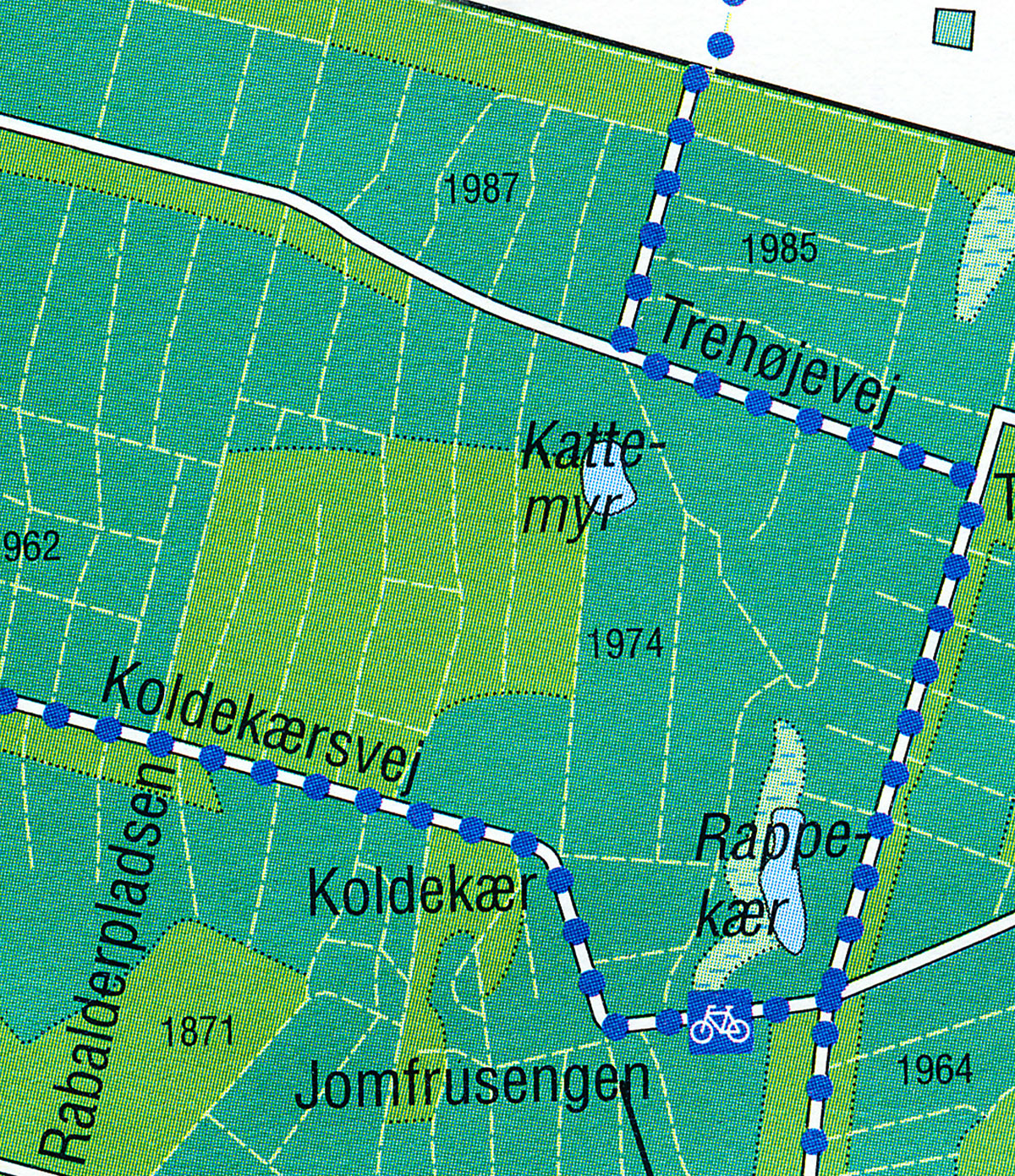 Trehøje, Langemyre, Kattemyre og Koldekær er sammen med Rappekær og Jomfrusengen lokaliteter i den del af Almindingen, der i Hans Rømers tid lå umiddelbart i nærheden af det nordøstlige knæk af hans 10 km lange stengærde.