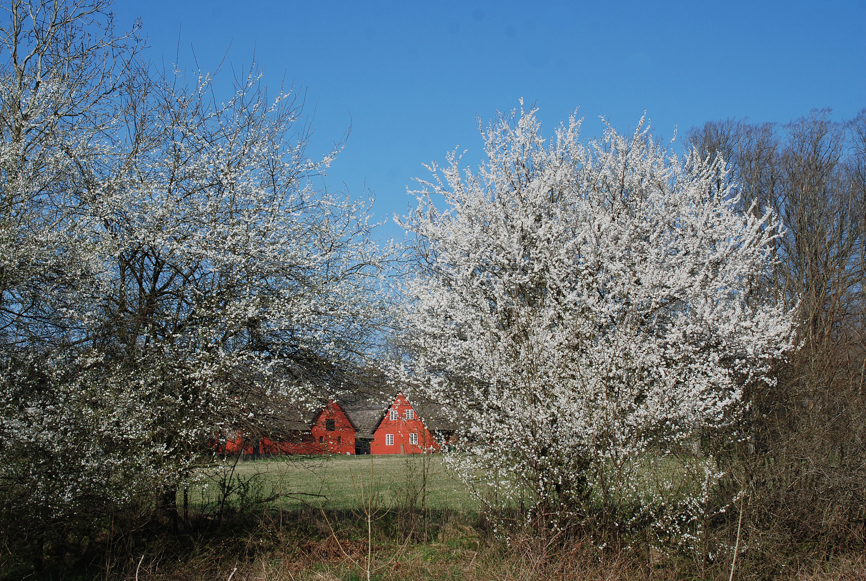 Kolle Kildehus omgivet af mirabeller i det tidlige forår