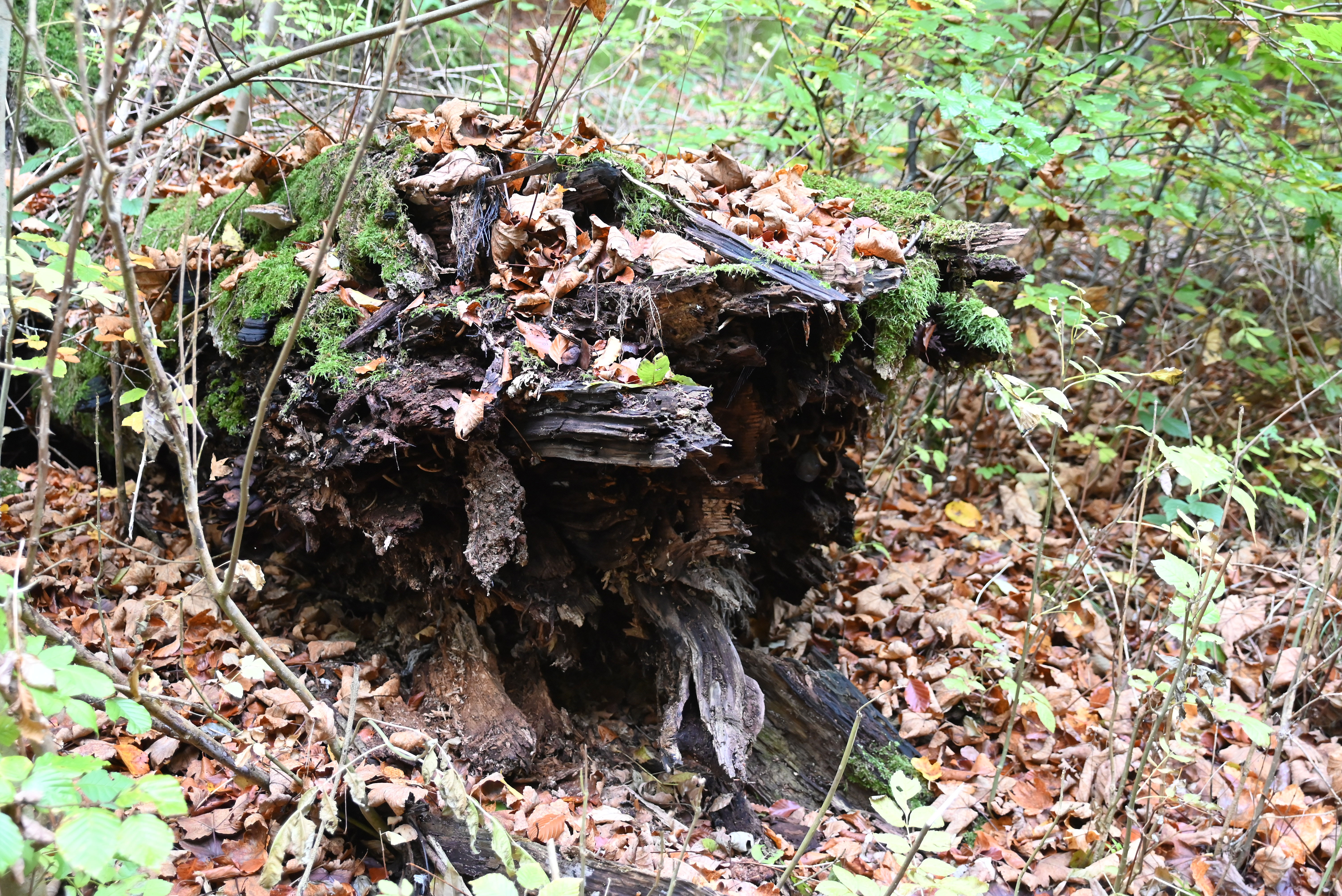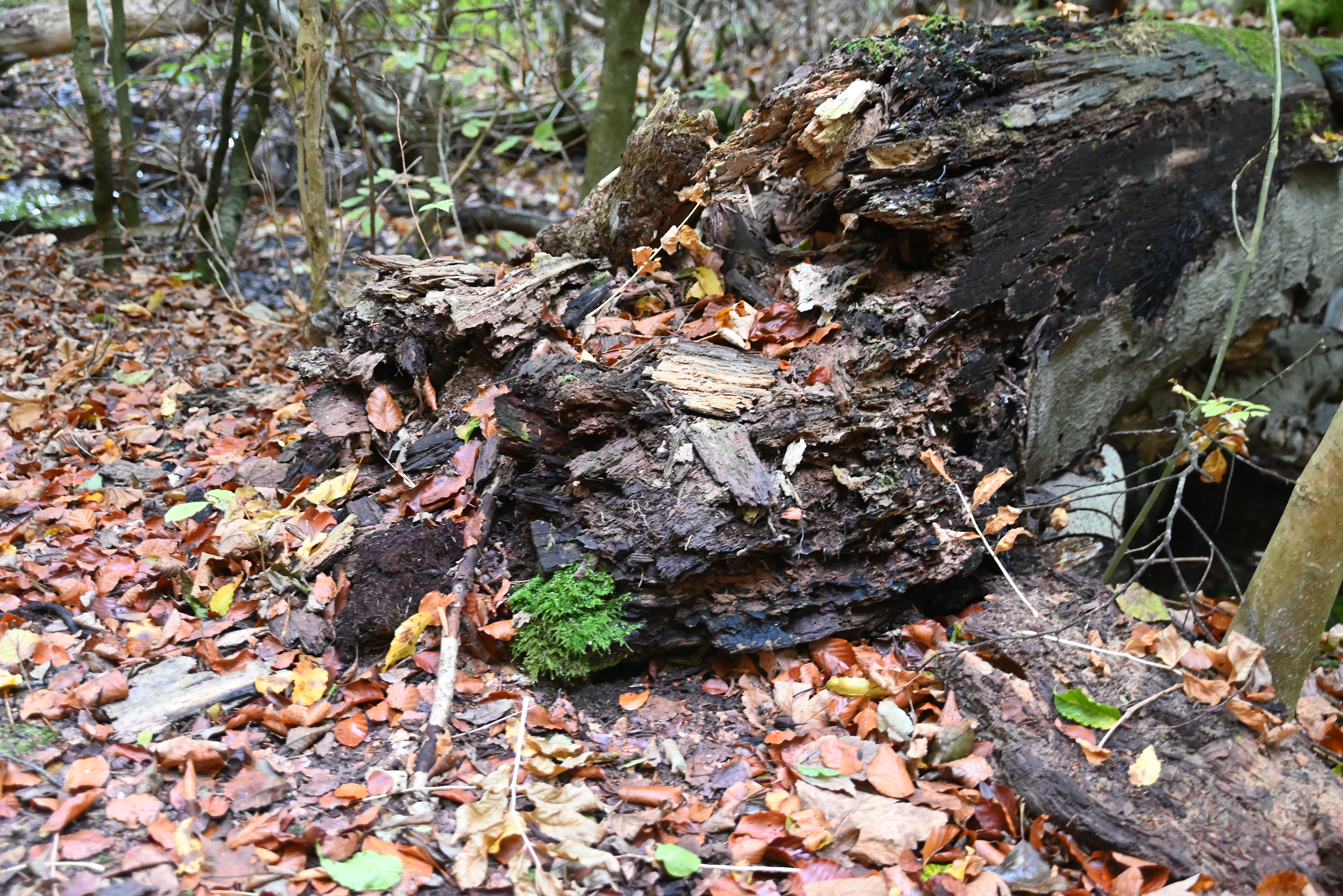 I oktober 2025 var nedbrydningen af træet ret fremskredent - med et orgie af svampe og insekter.