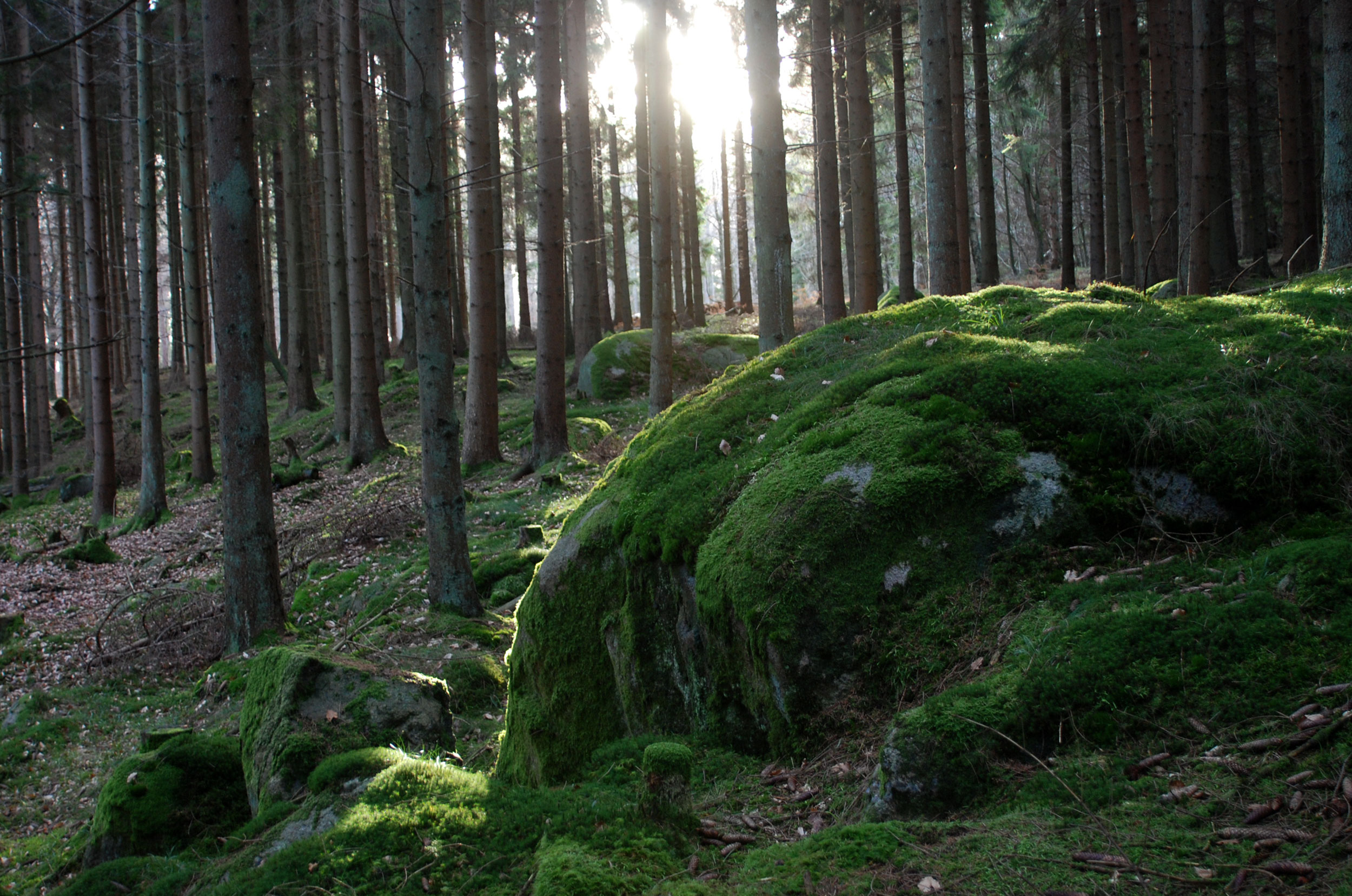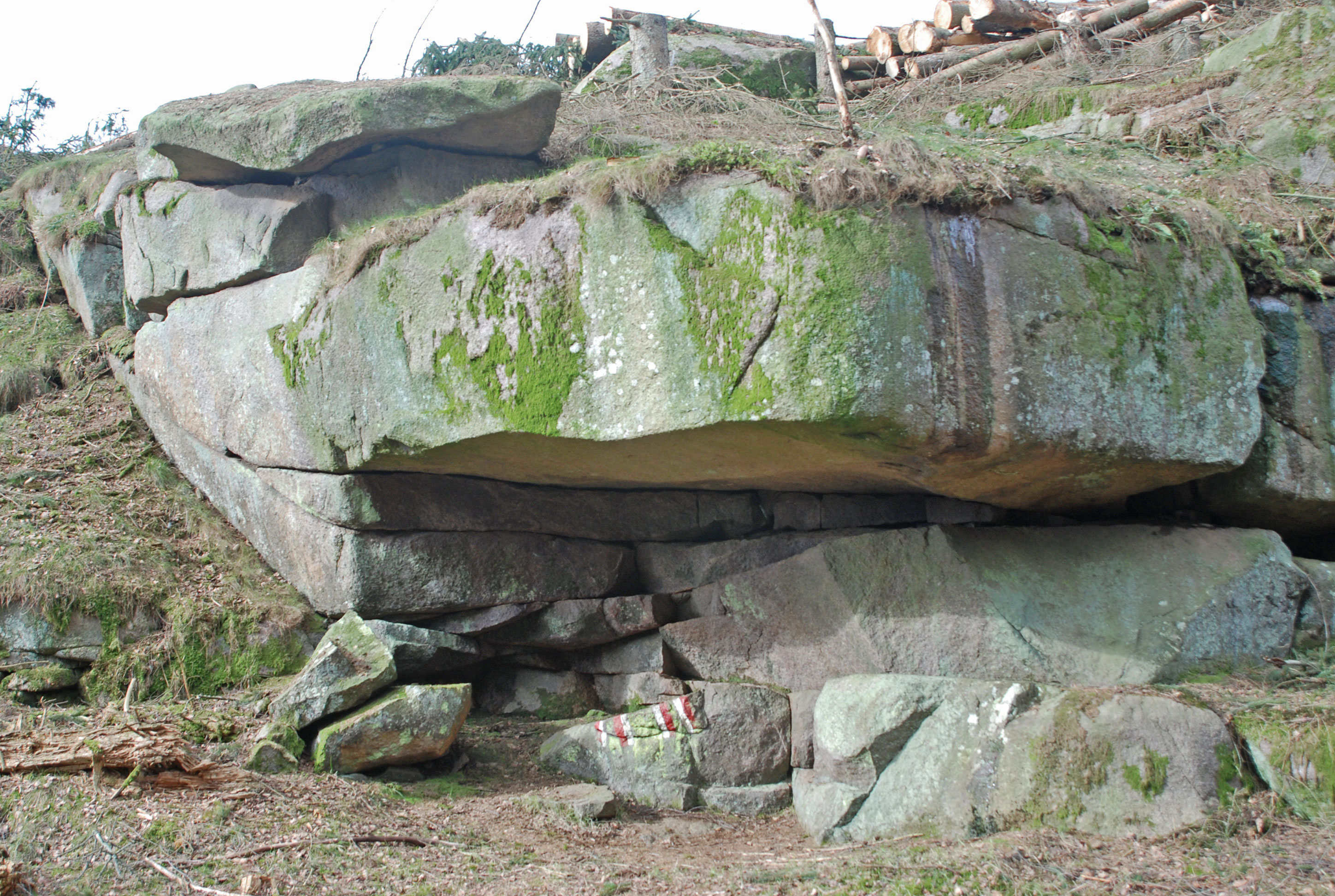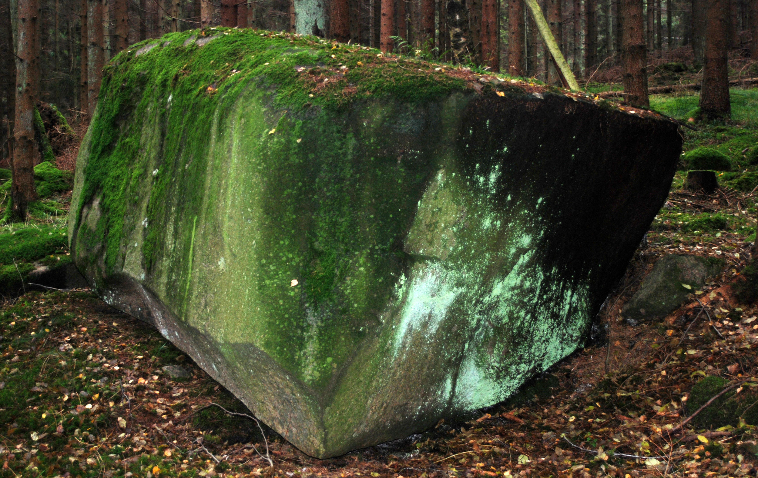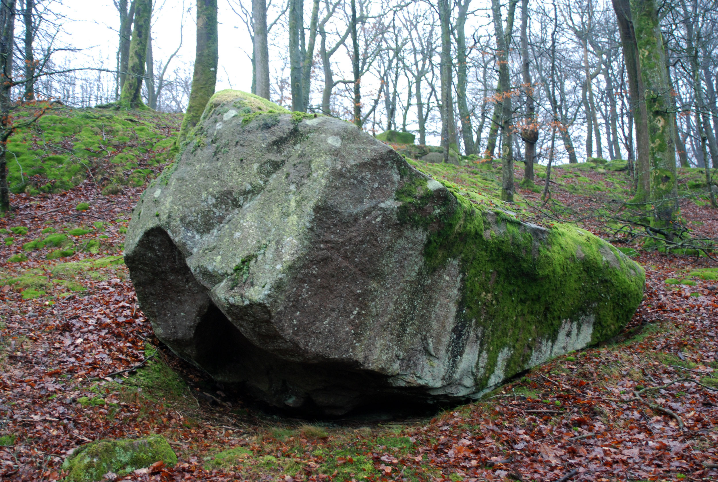 Utallige større og mindre klippestykker ligger løst på østskråningen, for tiden godt nok gemt væk i mørk granskov.