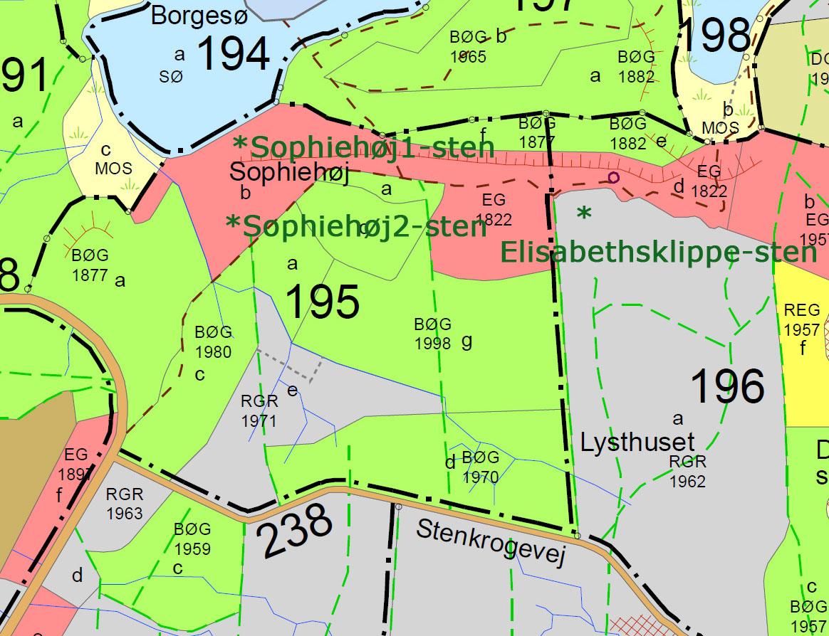 Det tredje tilsvarende monumentale udsigtspunkt, denne gang over Borgesø og Lilleborg ovenpå den vestlige ende af den brante klint ovenover søen, bærer betegnelsen Sophiehøj.