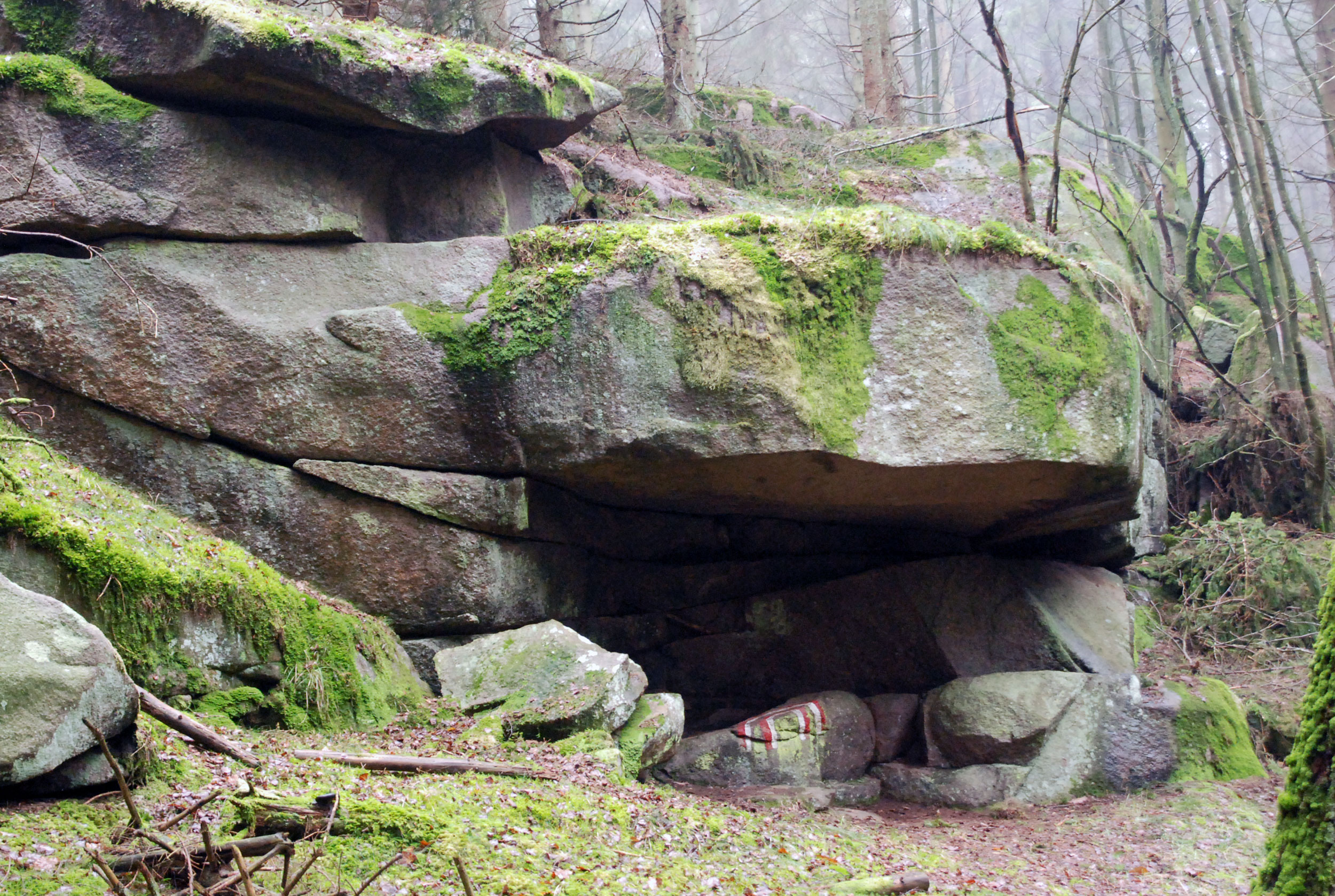 Også denne seværdighed var et sted på stien, markeret med Dannebrogsbånd. Læs mere om Skovrider Steens markeringer af stier i Almindingen ved at trykke her.