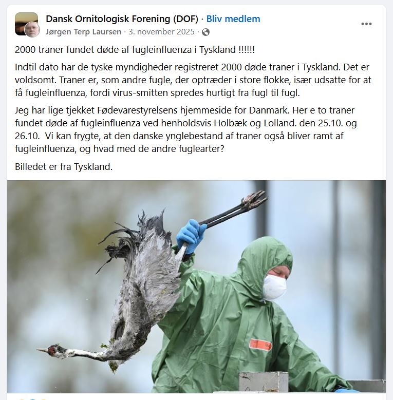Traner har ligeledes været ramt af sygdom i efteråret 2025, og på fuglenes rastepladser i Tyskland har man registreret store mængder syge traner. Tryk her og læs mere.