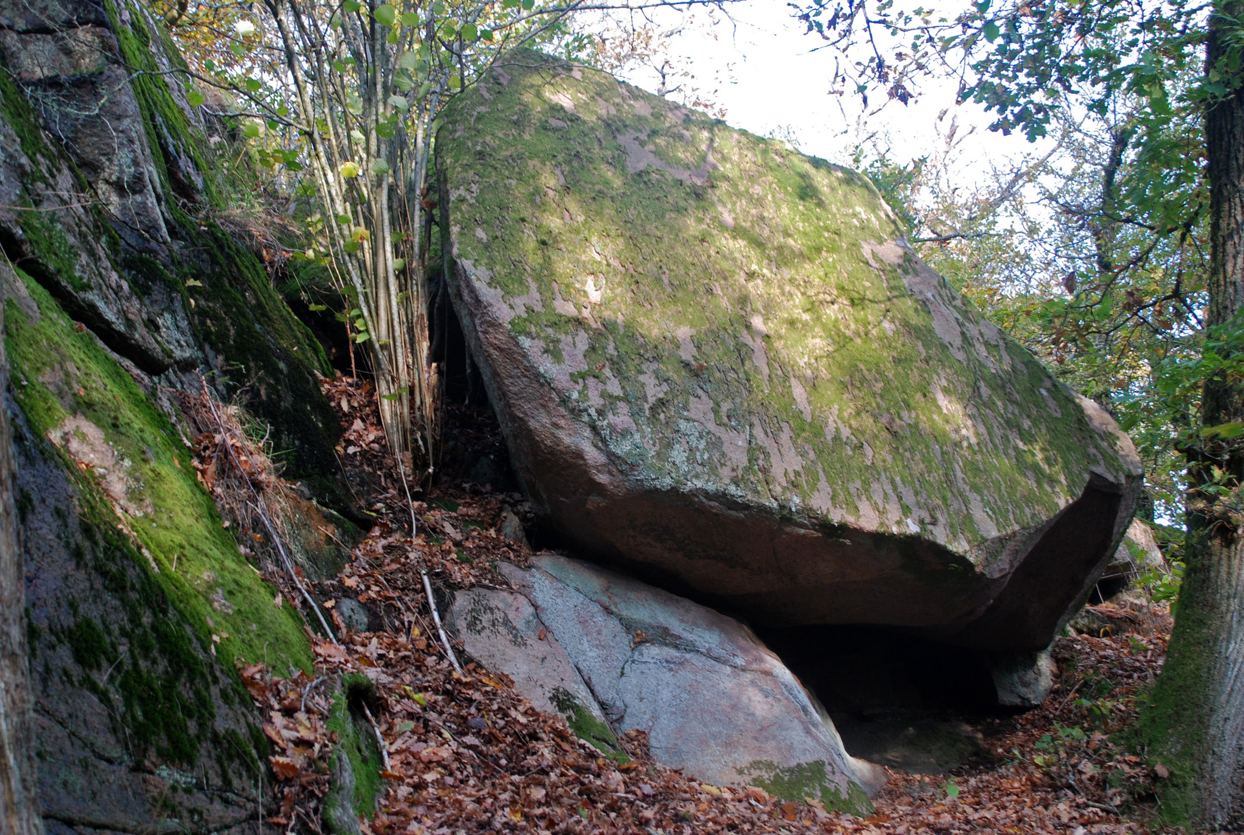 I fortsættelse af uren over Logulvet, tryk her, er der på skråningen "under" Dronningeklippen et større antal større og mindre løsrevne klippeblokke samt et større antal grotter.