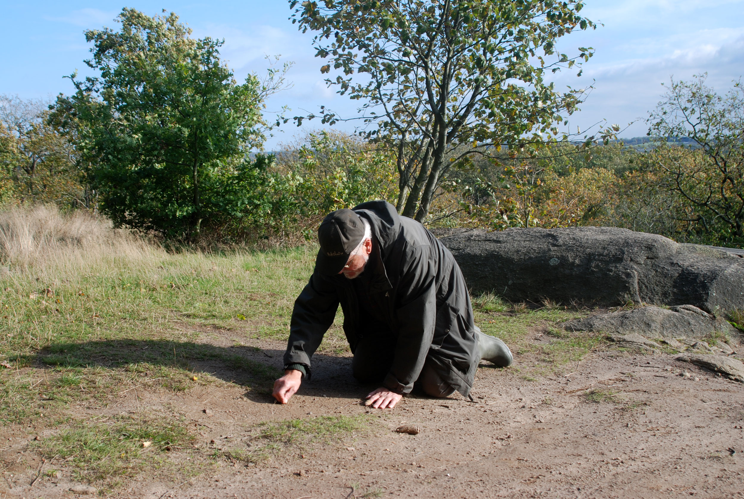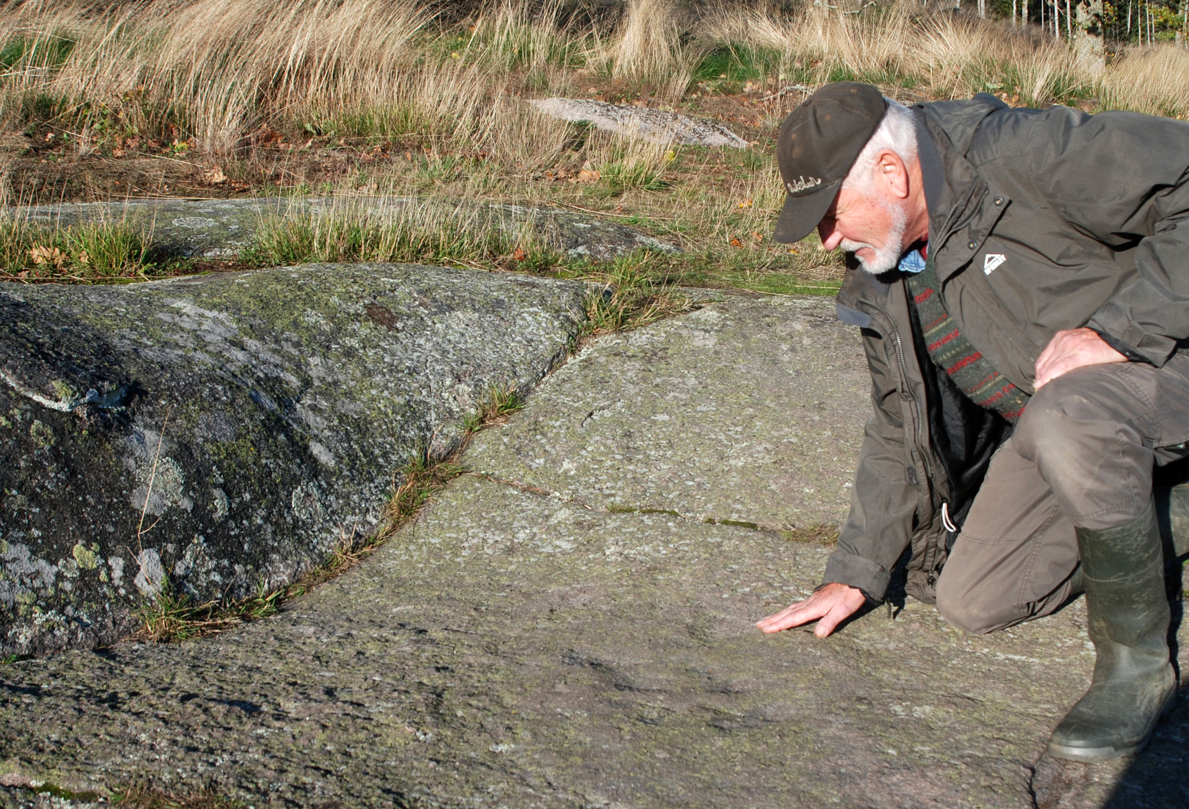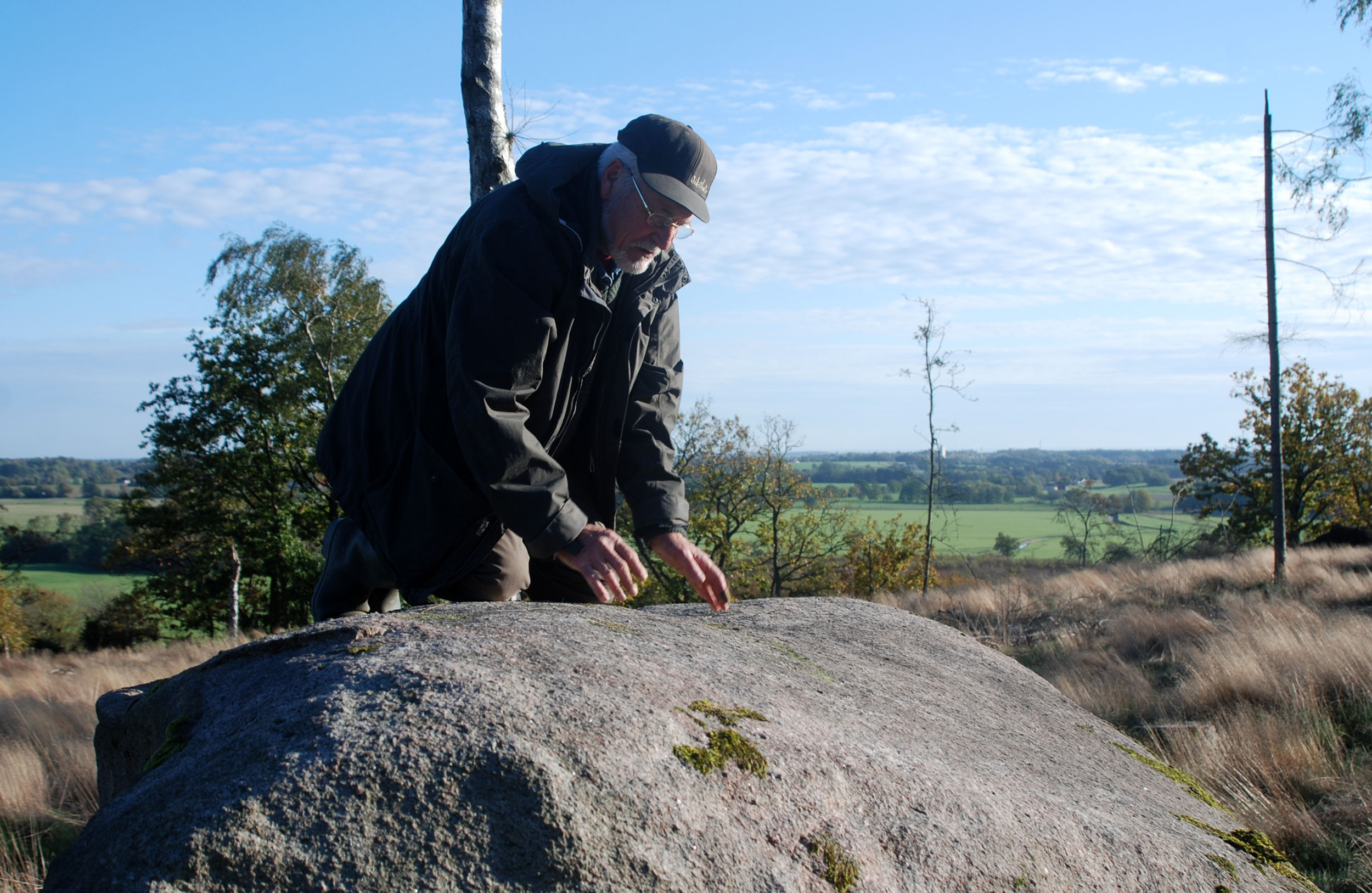 Mogens Jensen undersøger en af Krakbakkens vandreblokke for eventuelle helleristninger