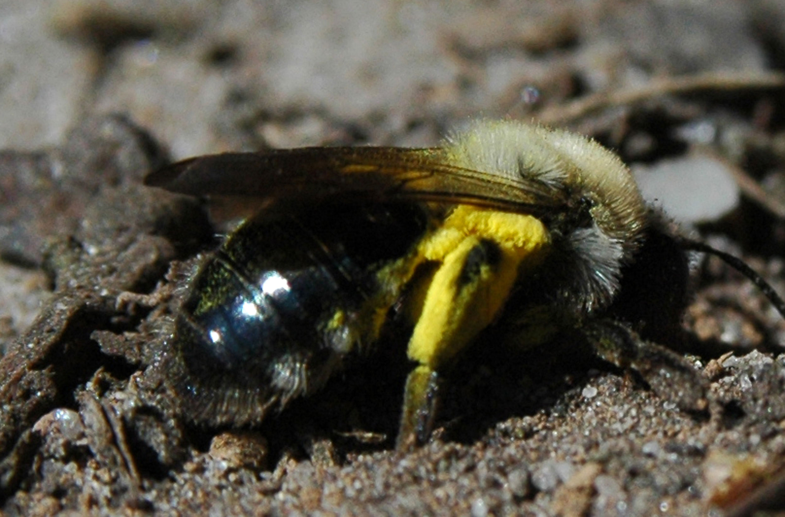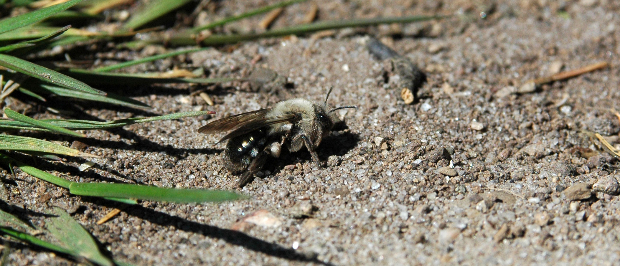 For, kigger man nærmere efter, kan man under vingerne på nogle af bierne se en cylinderformet stav. Det er et parasiterende insekt, en Viftevinge, Stylops melittae.