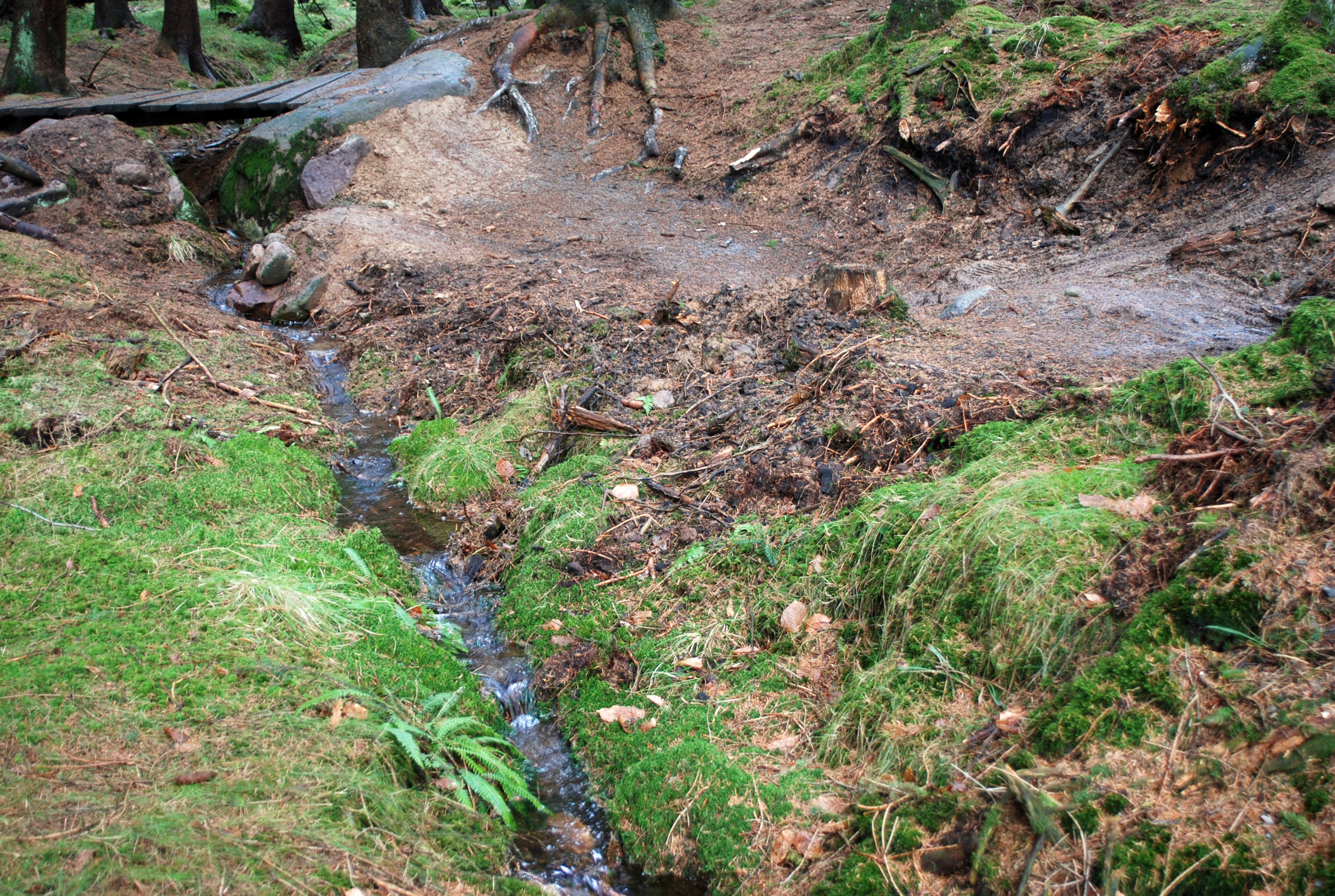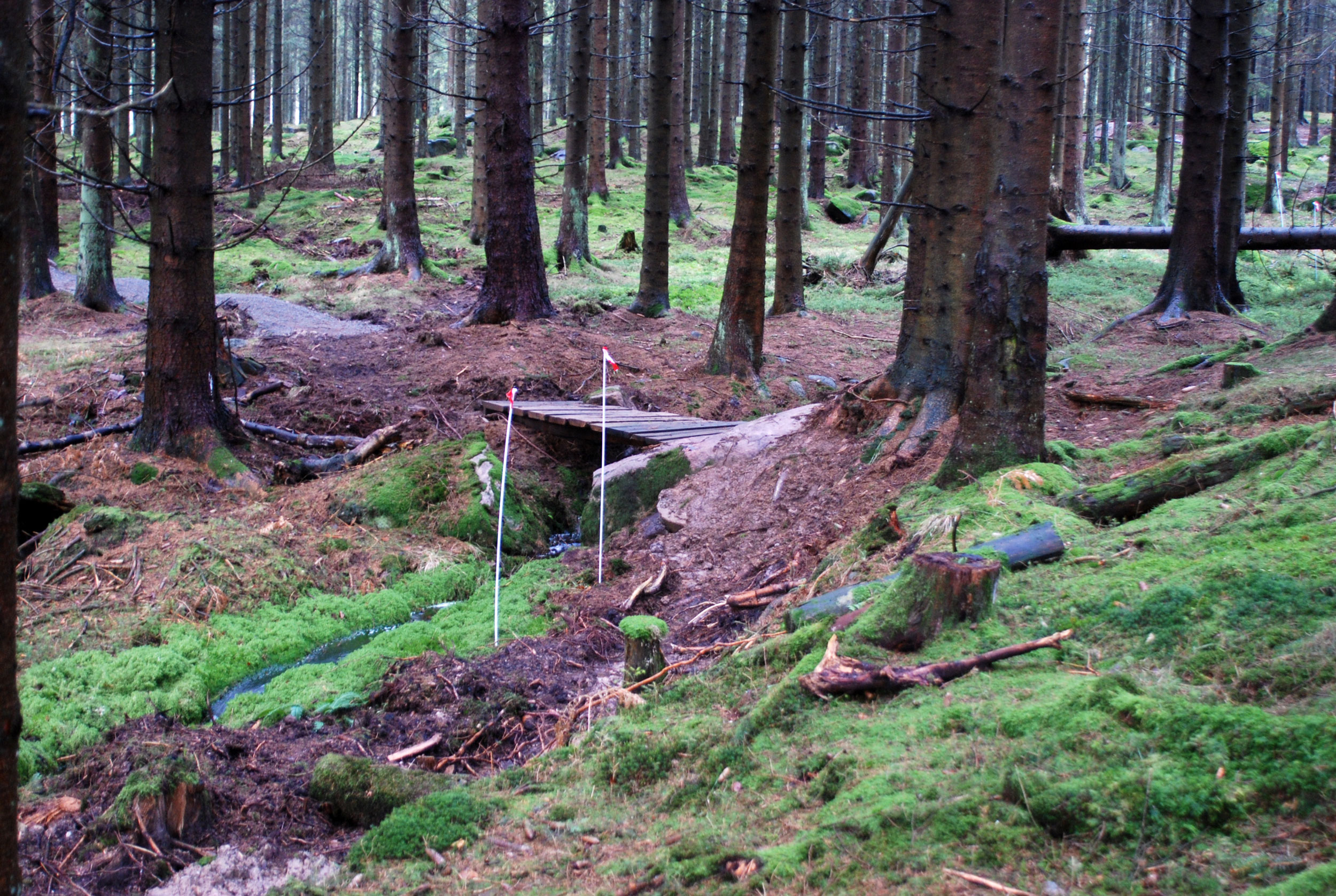 Gedebæk og udbygget mountainbikespor gennem bevoksningen af Sphagnum og Kambregne i marts 2021