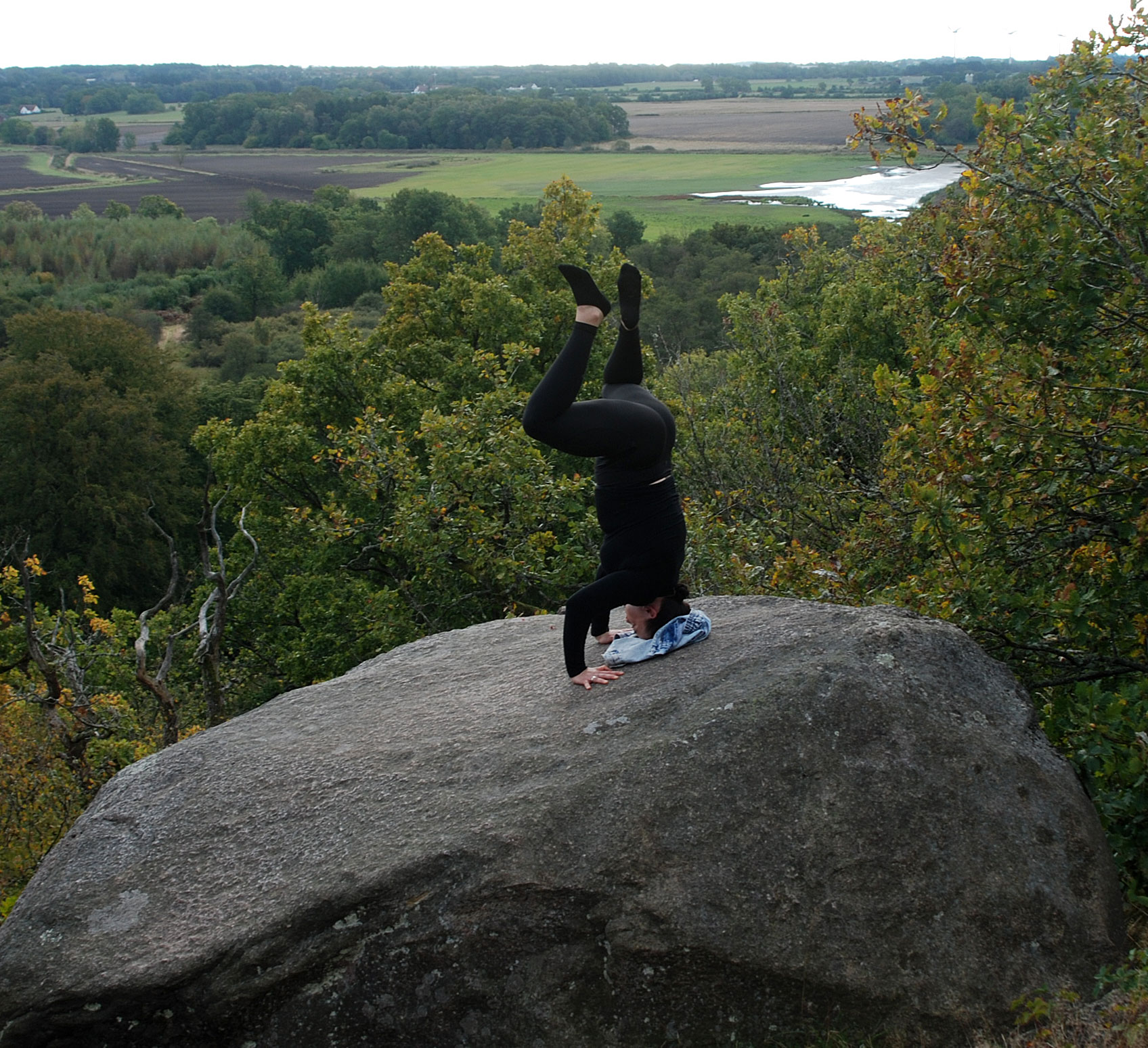 En flot "hovedstand" på en af Styrtebakkernes mange vandreblokke ved Dronningestenen og med udsigt over Vallenskæret. Oktober 2024
