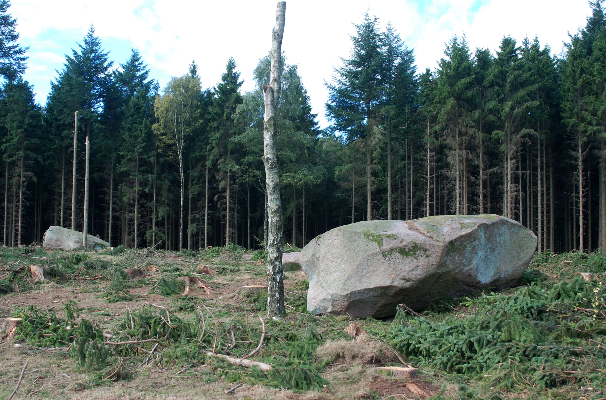 Rødgranerne nord for stien forbi Dronningestenen blev plantet i 1960, og efterhånden som der bliver lysnet op i den mørke granskov, som det skete efteråret 2018, opdager man "skjulte" mindesmærker.