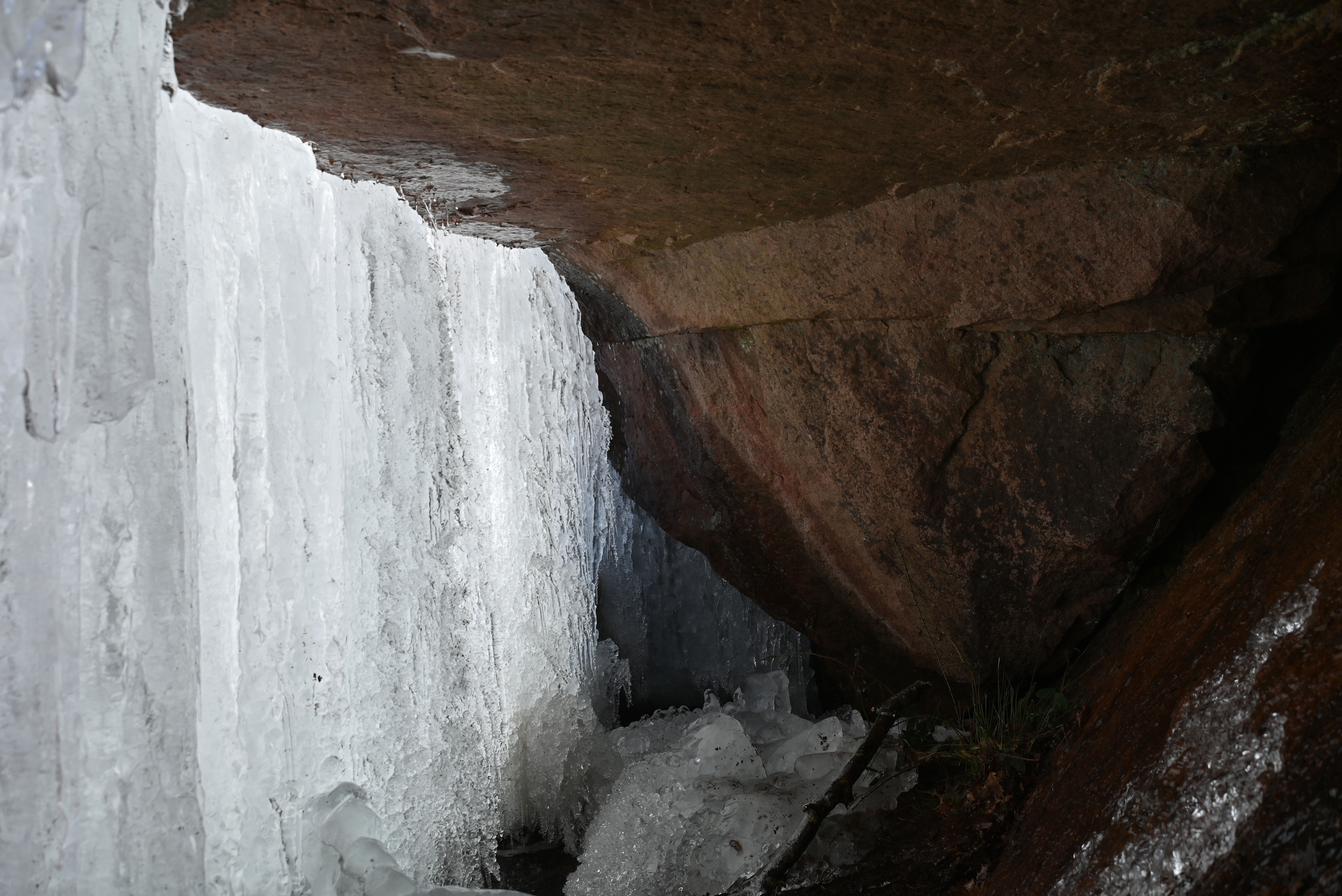 Ligeledes er det muligt at se, hvorledes vandet løber gennem sprækker i klippen. Og når det så fryser til is, er en opsprækning af granitten påbegyndt.