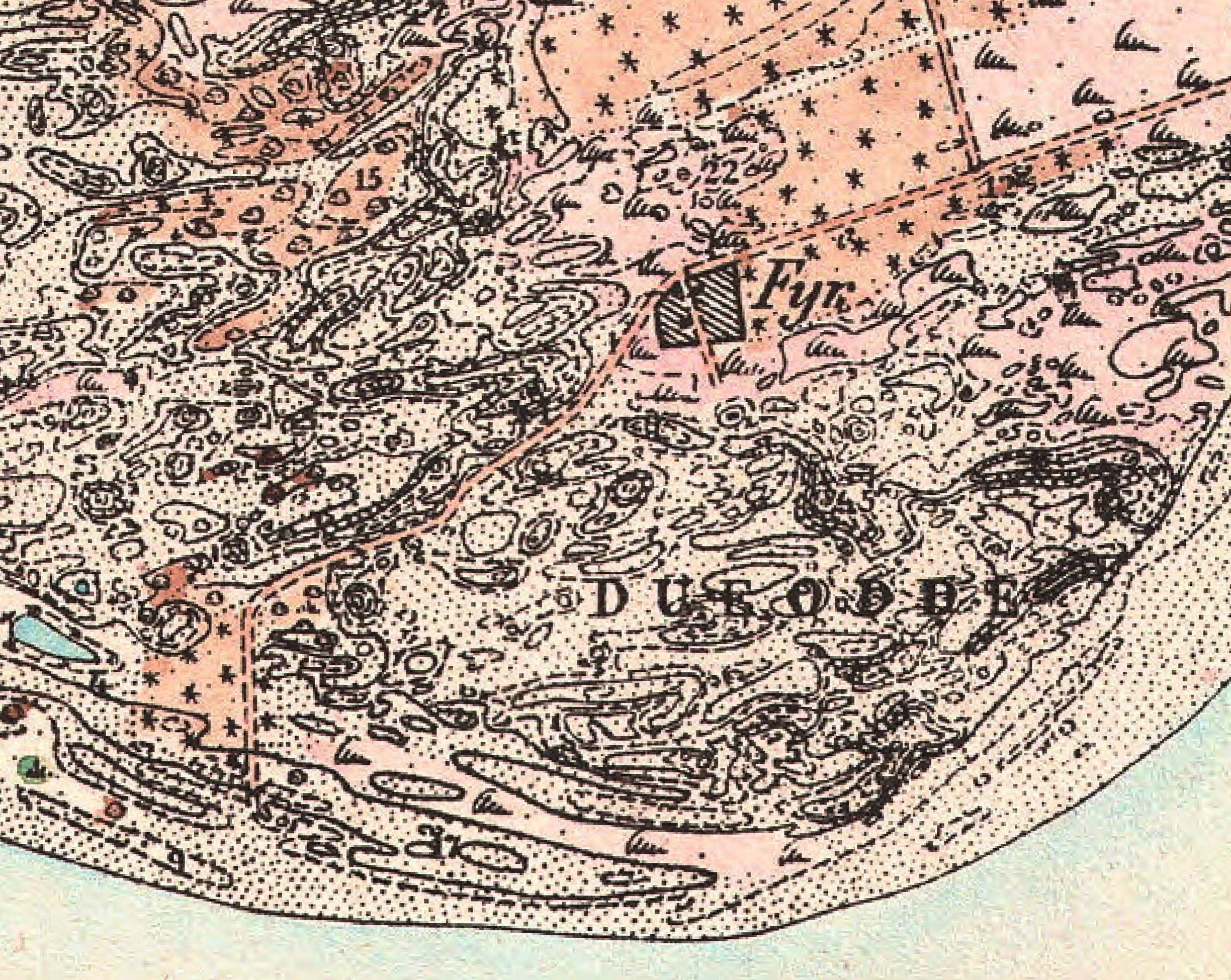 Først sidst i 1870'erne blev der bygget fyrtårn ved Dueodde, et hovedfyr ved Duegård langt inde i landet, hvor det kunne funderes på fast klippe, Grøn Skifer, og et mindre bifyr på sandet midt ude i klitterne.