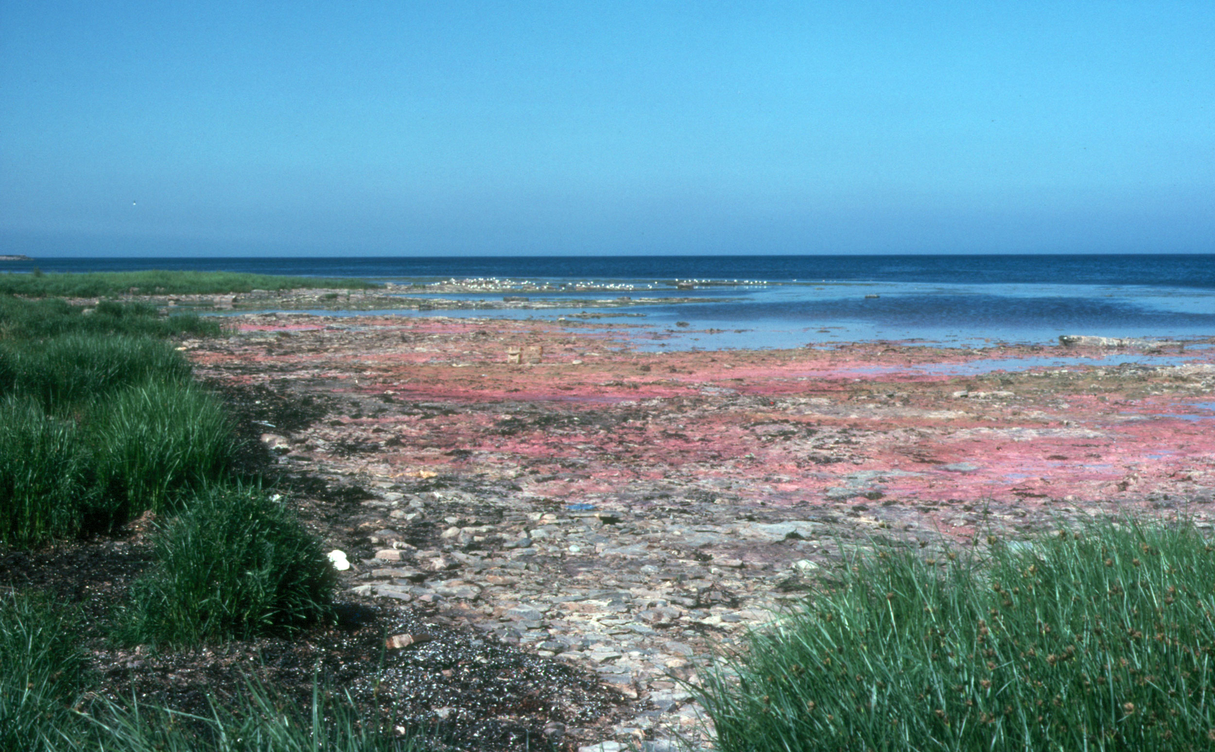 De let skrånende lag af nexøsandsten ud fra kysten skaber umiddelbart syd for Nexø by et større kystnært fladvand.