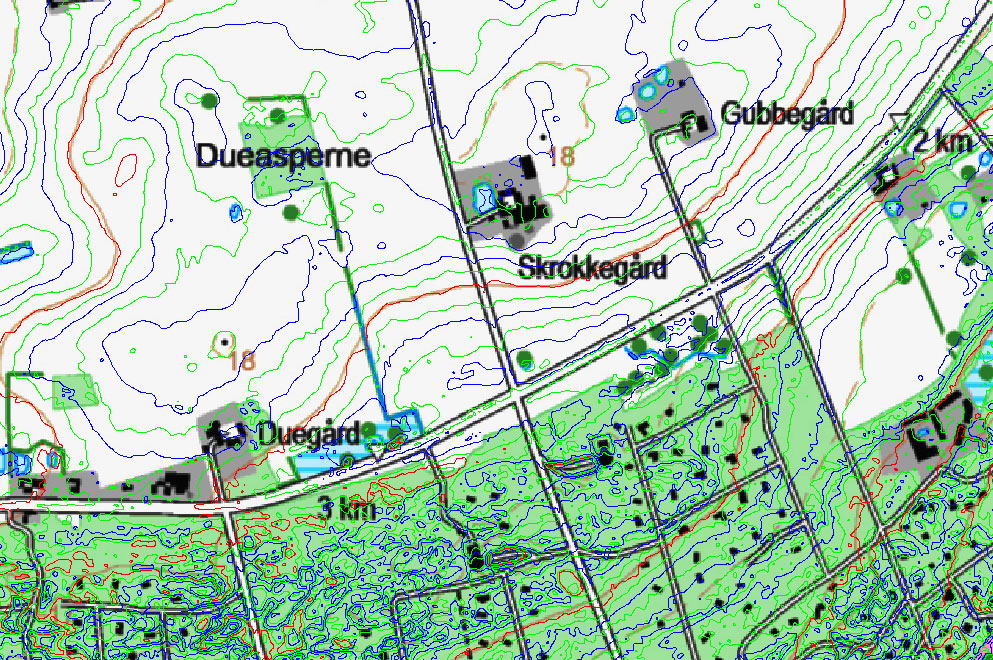 Grøn Skifer ligger flere steder helt oppe i overfladen af dyrknings jorderne og skaber flere steder eng-agtige arealer