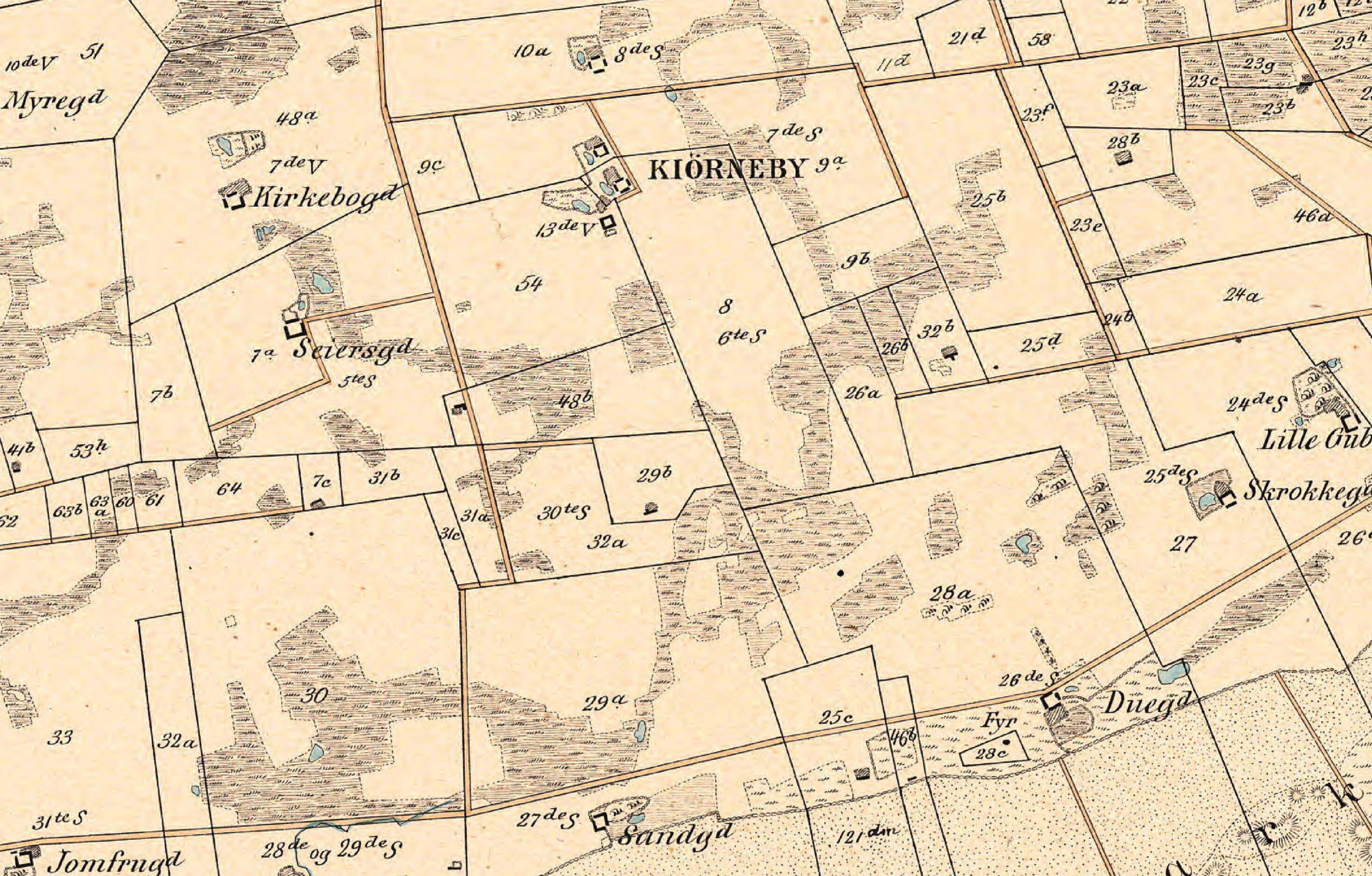Sognekortet over Povlsker Sogn 1864 med vidtstrakte enge syd for "Kiörneby".