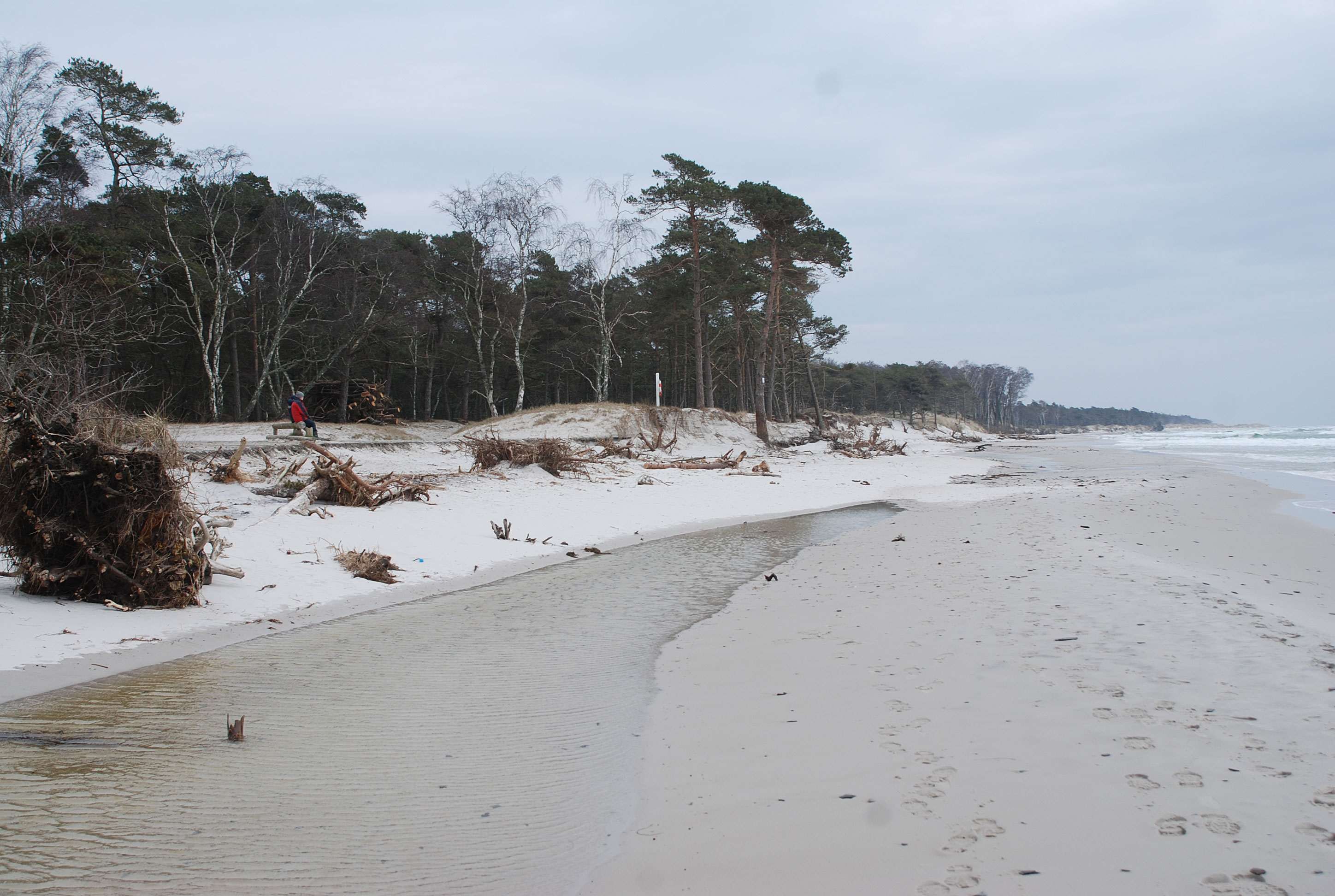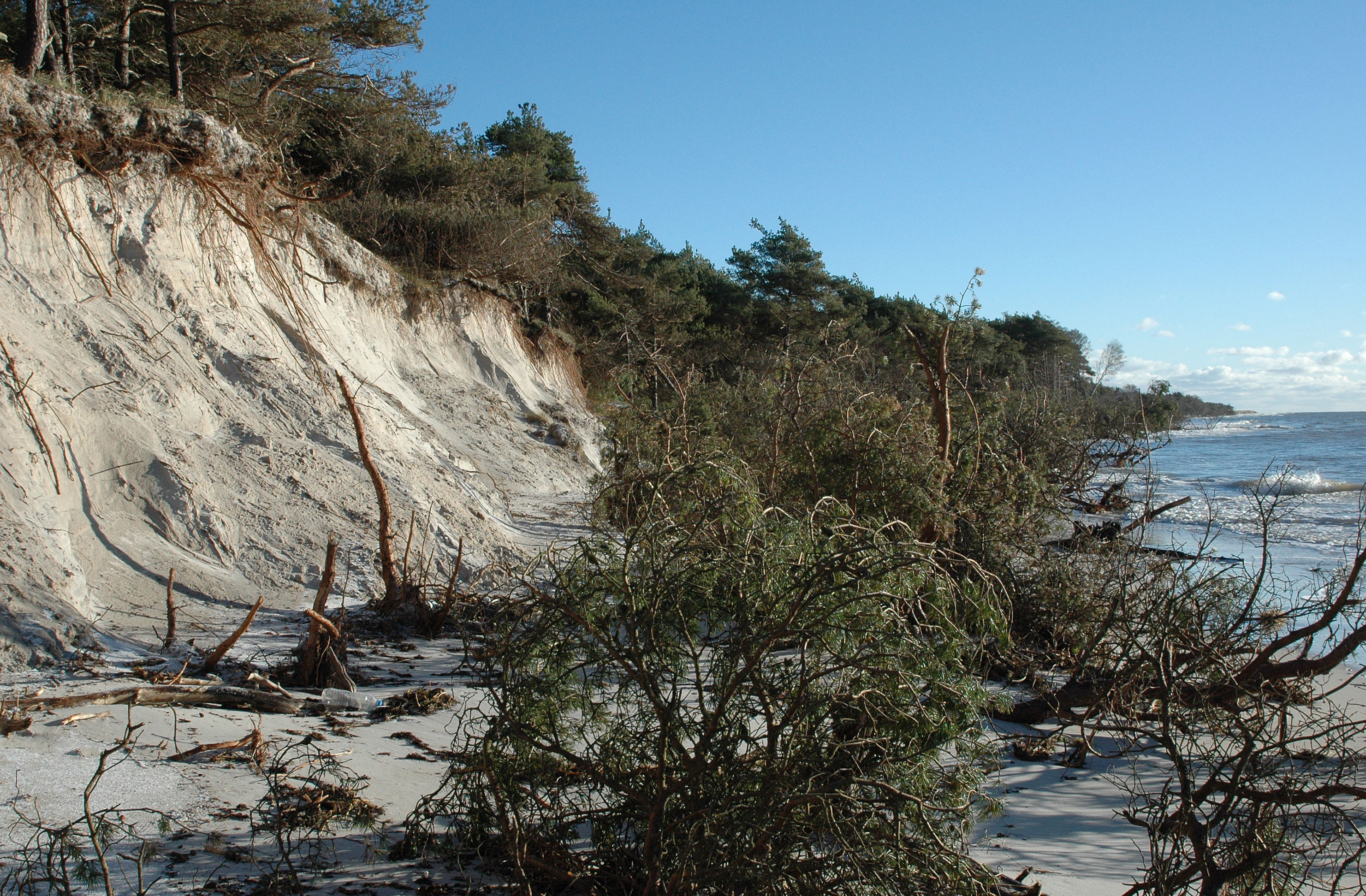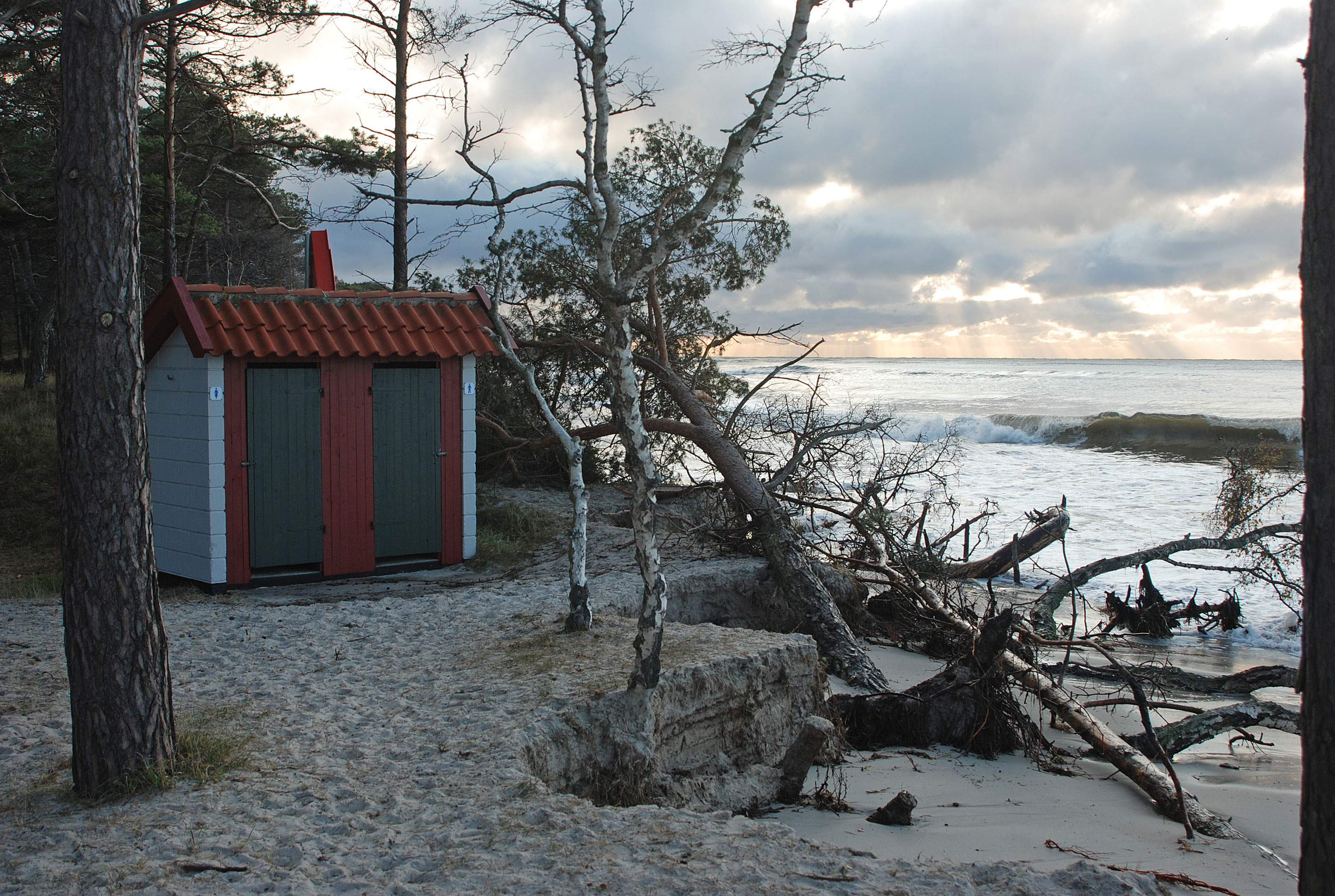 I de seneste par vintre har klitterne i Jomfrugårdsskoven og stranden udenfor stået for tur med en del væltede fyrretræer som resultat - ja endog en sivebrønd forbundet til det kommunale toilet blev bølgernes bytte i det tidlige forår 2007.
