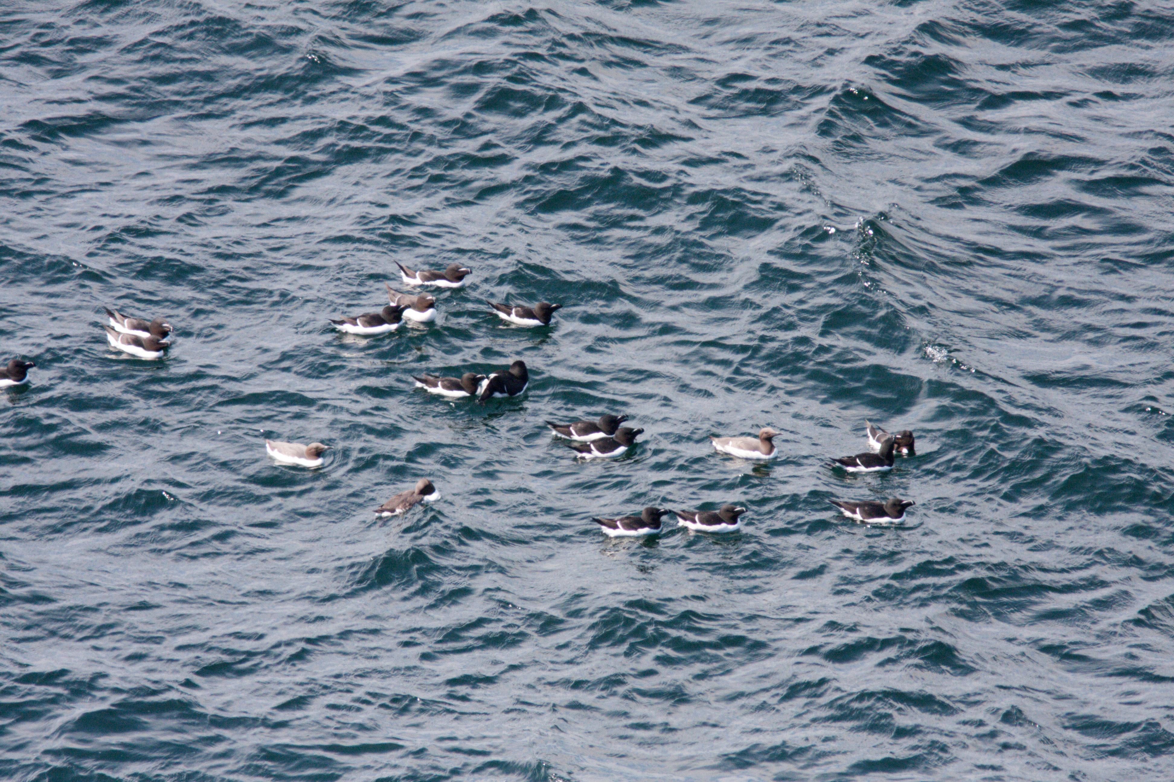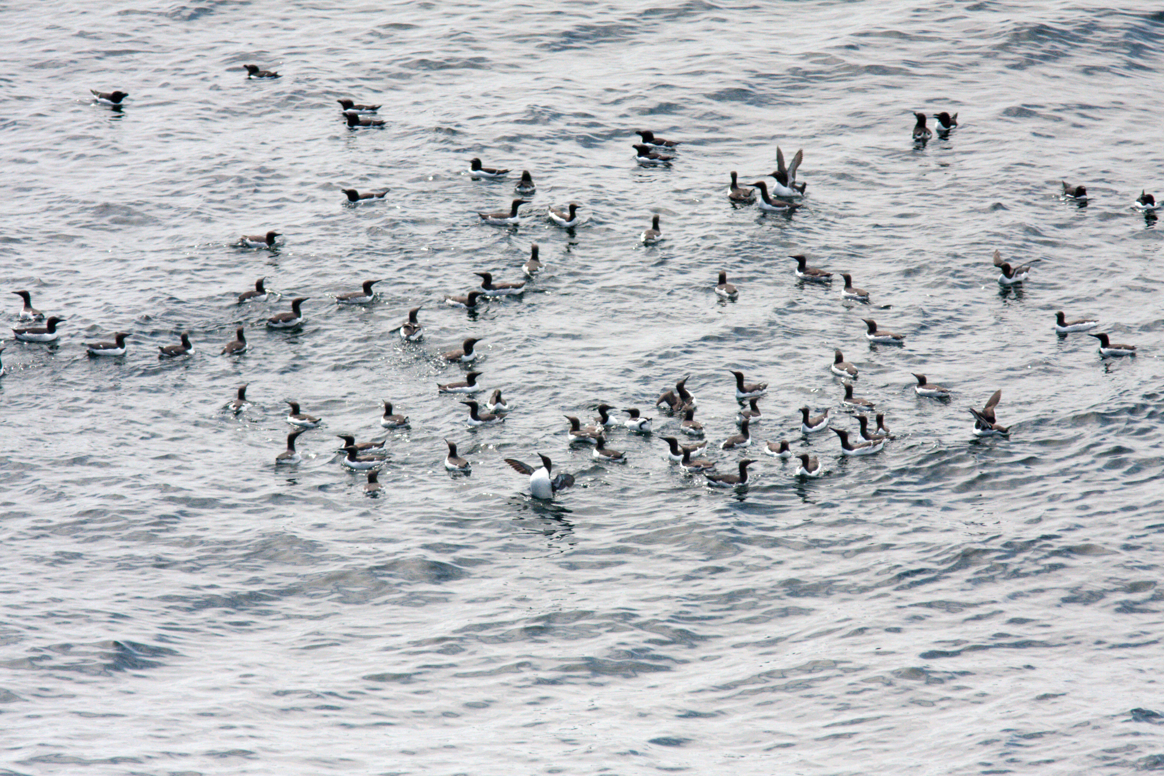 En større flok Lomvier i deres parringsspil på vandet neden for Kongestolen - midt i maj 2021
