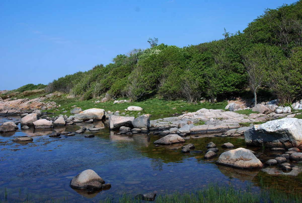 Følger man kysten fra Salomons Kapel mod vest bemærker man forskellige væld oppe fra bakkerne. Her er der planter som Mose-Troldurt, nok øens eneste kendte vokseplads for tiden.