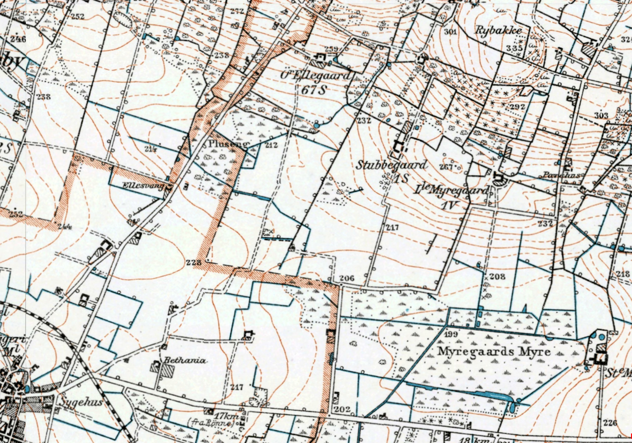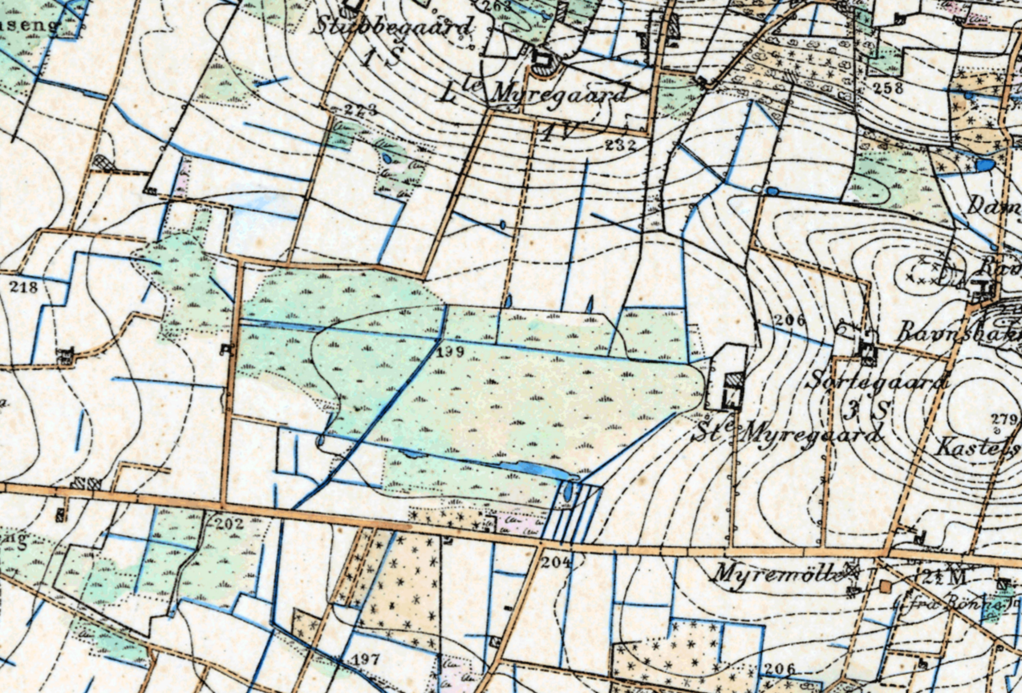Her er der plads til noget mere vand, hvis det sætter ind med regnskyl i større mængderMyregaardsmyren 1880 på sognekortet