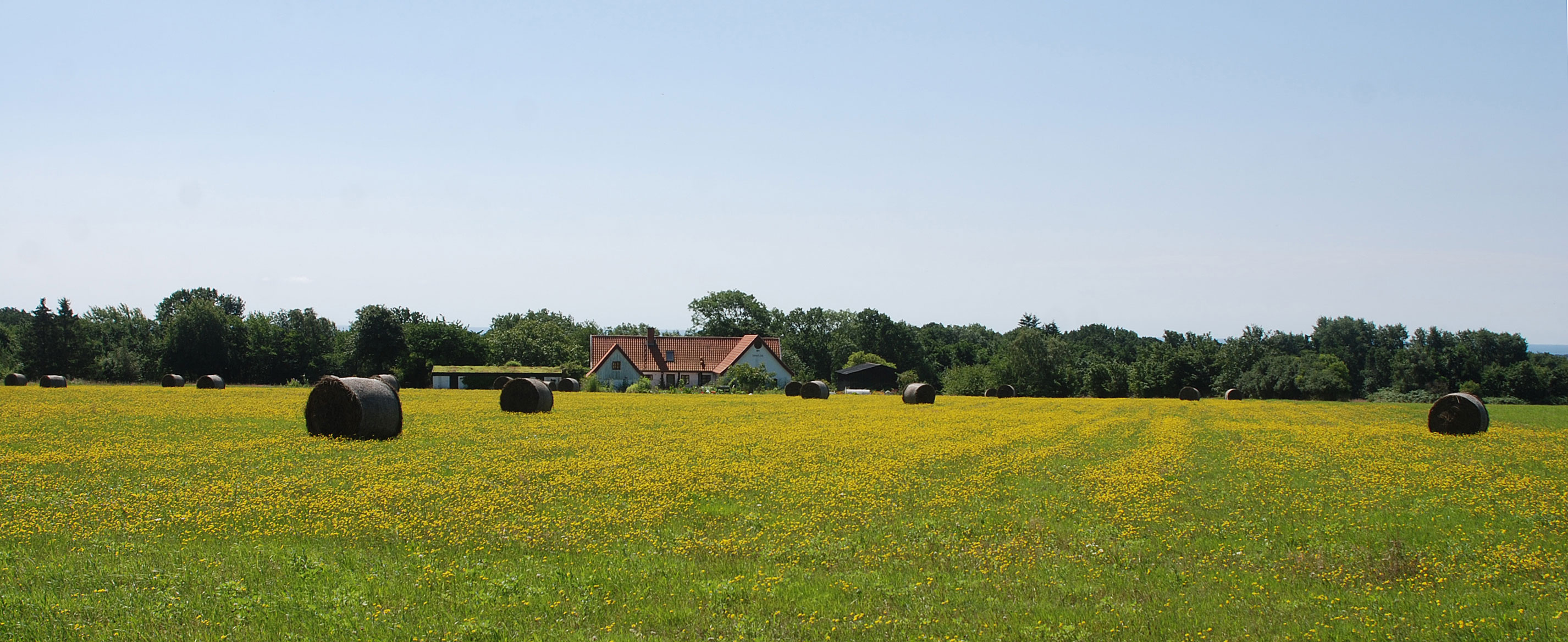 Udmarkshøj sommeren 2024 - lyngen brudt for længst og nu høstes hø, og marken prydes efterfølgende af gule Høgeskæg