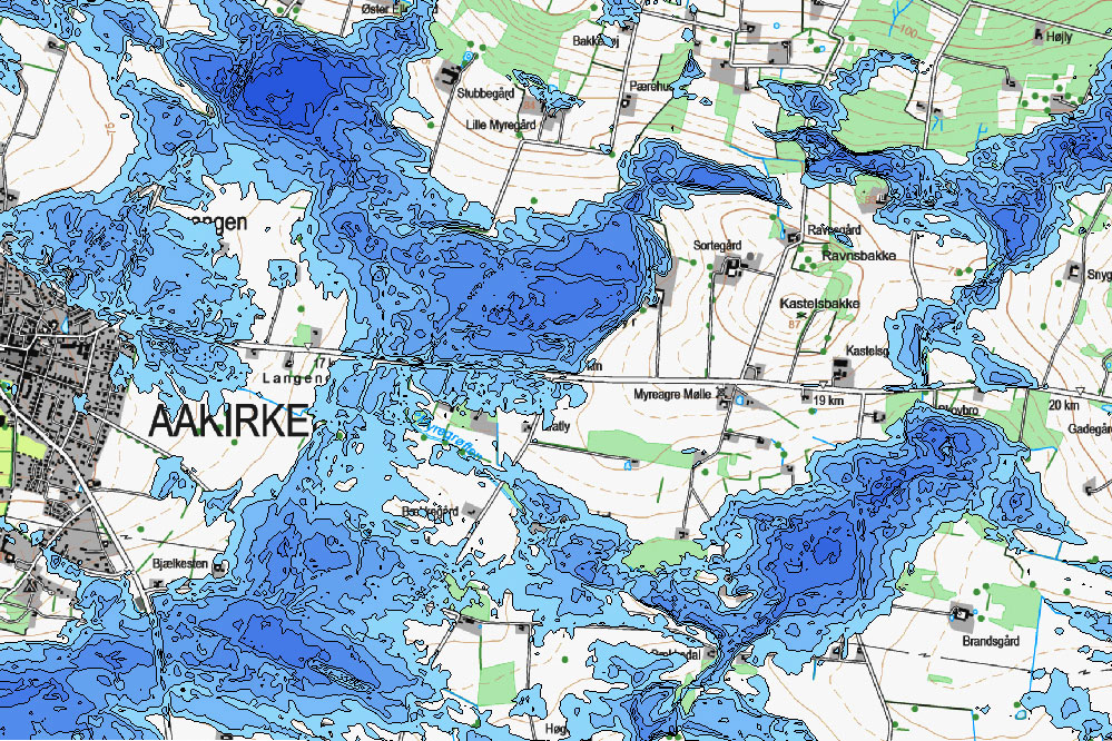 Og så kan man på Regionskommunens kortværk få et indblik i områdets risiko for oversvømmelse i tilfælde af, at en forventelig kommende "monsterregn" falder over øen.