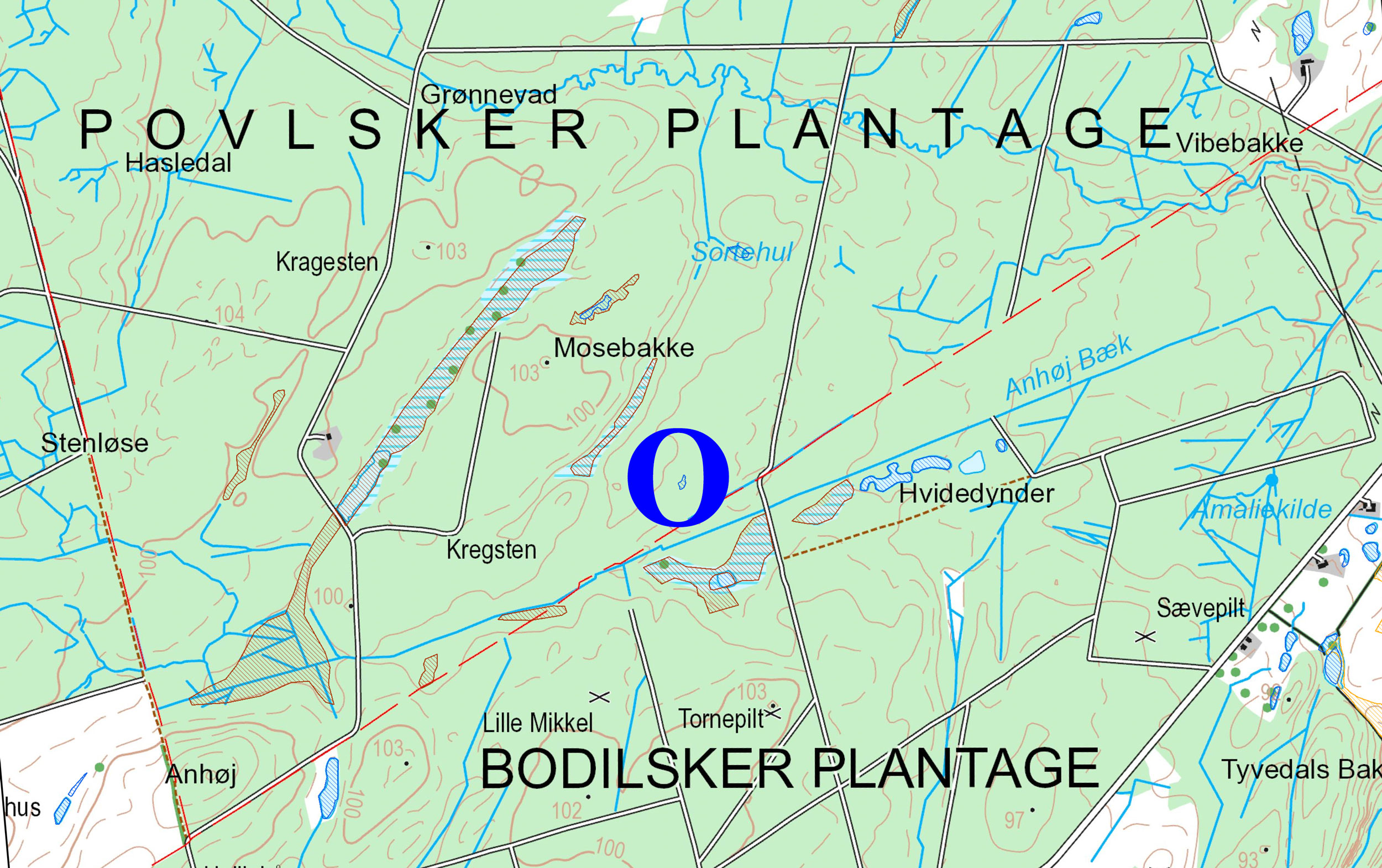 §§3-arealer i dele af Bodilsker og Povlsker Plantager. Blå cirkel indikerer vokseplads for Revling
