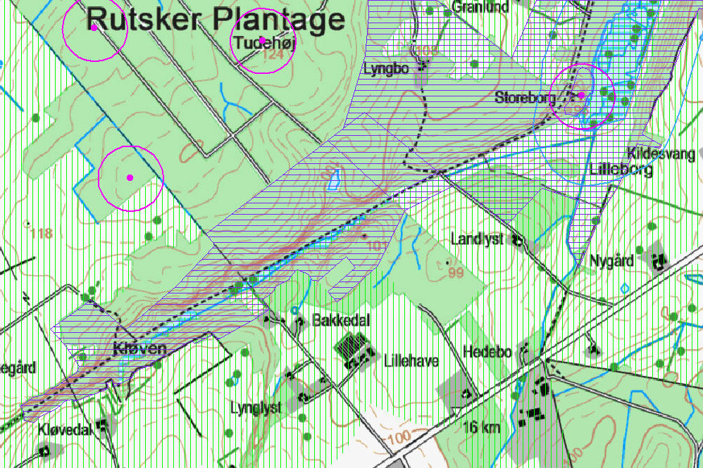 Højdekurverne indlagt på seneste Målebordsblad for området