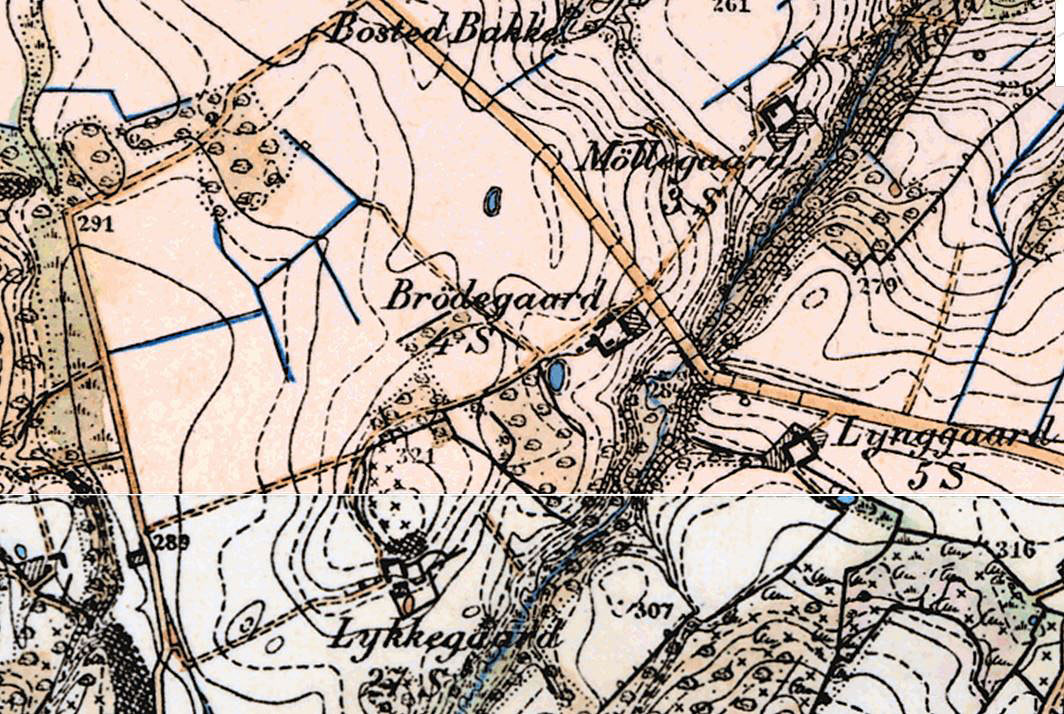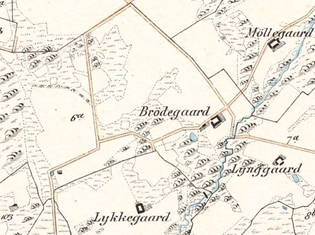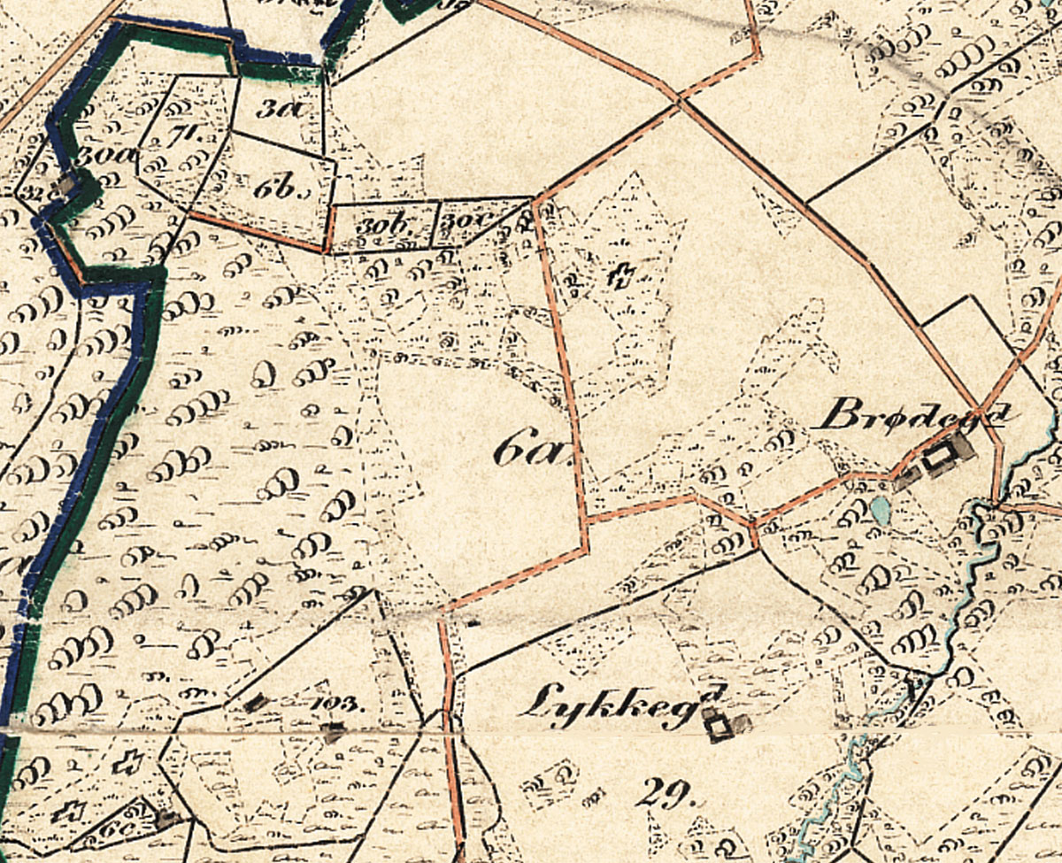 Den flade issøler-sletteIsdæmmet sø - på GrønlandLykkegård midt i 1700-talletBrødegårds vej op i Lyngen 1864Brøddegårds vej op i Lyngen før udmatrikuleringen af områdets jorder i 1844Vognmanden gravede med ældre maskinerRent og stenfrit ler til teglproduktion i RønneStor Skallesluger i en af lergraveneSlettevej i 1880ernePostruten lagt op ad ejendomsskellet efter udmatrikuleringen af jorderne efter 1844Postruten og skellet intakt i sommeren 2006Fældet ledelinie i form af en postrute langs ejendomsskellet mellem Brøddegård og LykkegårdSkellet fjernet - jorden planeret udEn omfattende hvedemark gennem skel og levende hegn - en begrænsning af mangfoldigheden i et åbent landskab