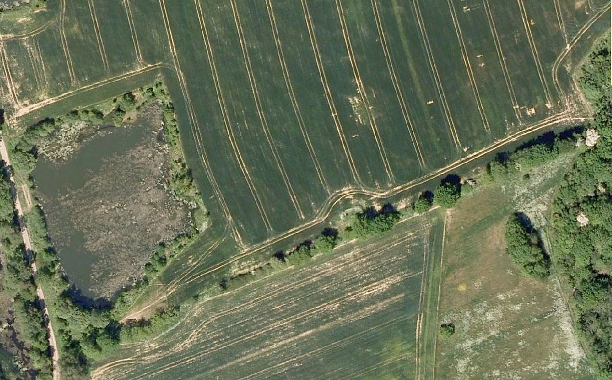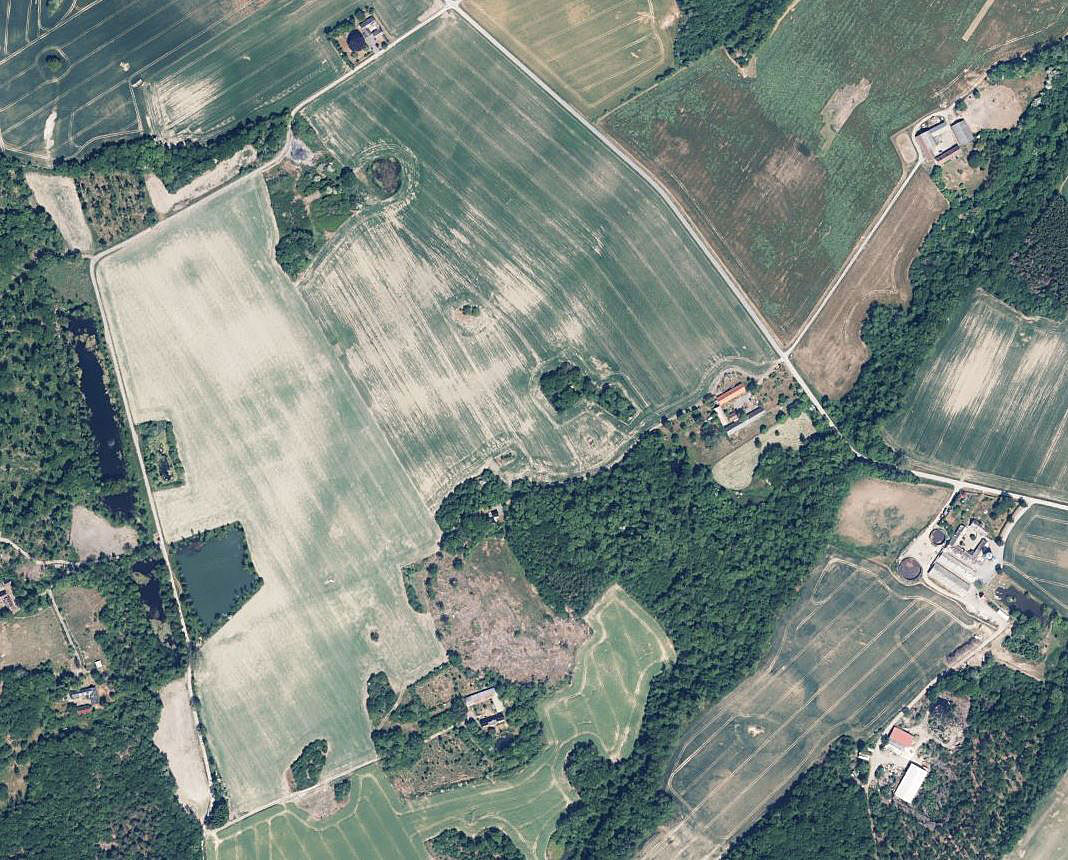 En stor hvedemark - en skygge afslører den tidligere postrute og skel- og ledelinie i landskabet ved Sletevej