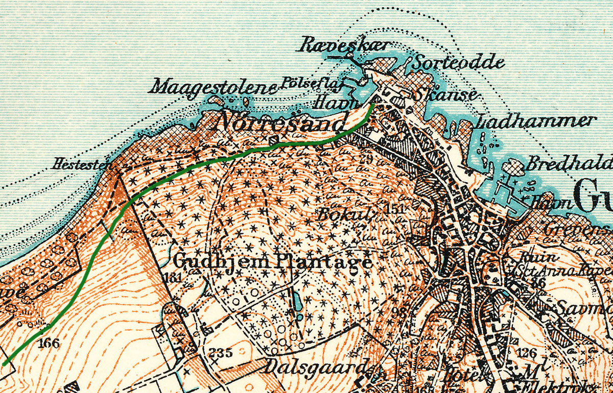 Og her ved nedkørslen til Nørresand på kanten af Bokulklippen var stien projekteret til at følge et af de skovspor, der blev etableret ved tilplantningen af datidens Gudhjem Udmark i 1880'erne.
