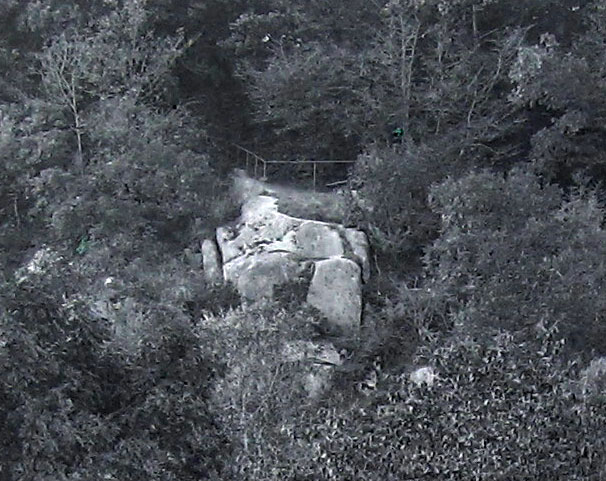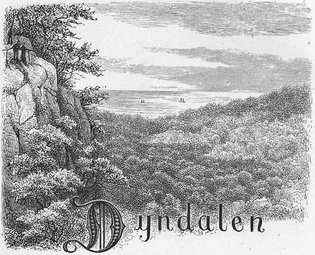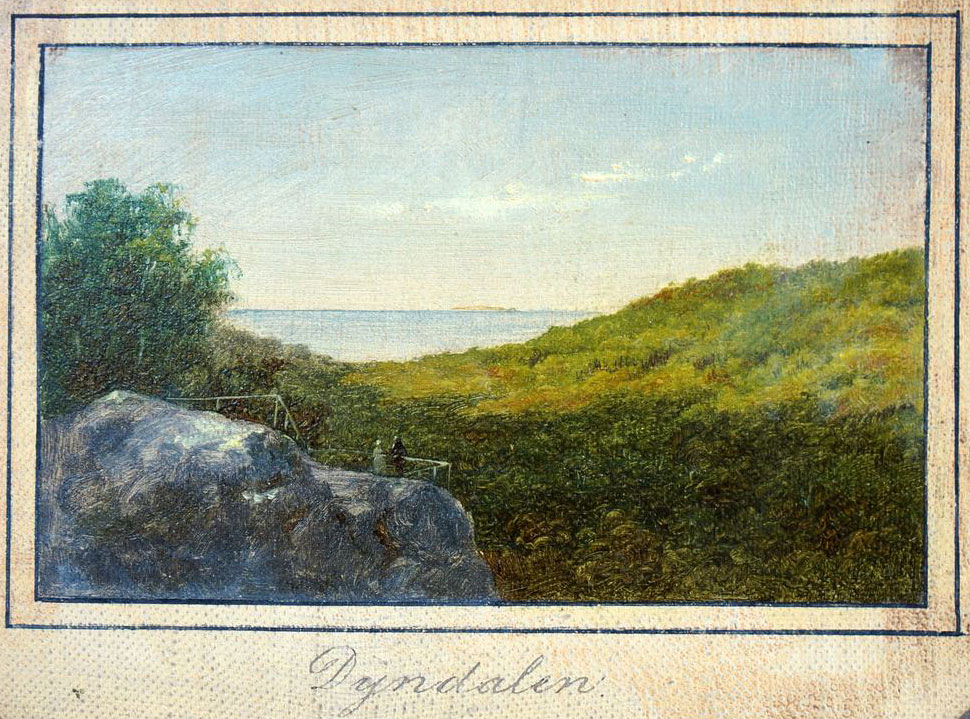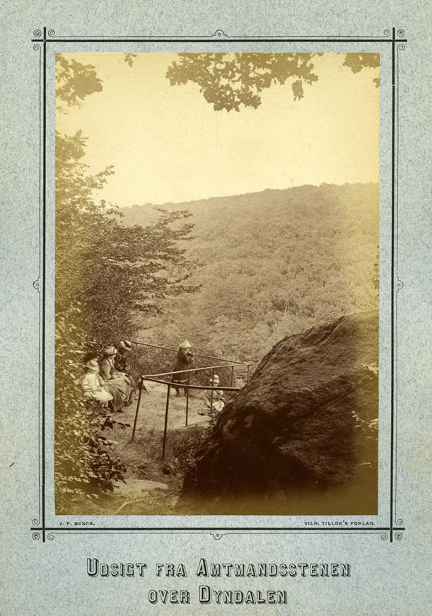 "... Her møder man den lille Sti fra Gaarden, man følger dens stedse opadgaaende Bugtninger gjennem Skoven langs den nordlige Rand af Dalstrøget og dens Bøining ned gjennem en lille Indhegning og overraskes da ved pludselig at befinde sig paa en høi Klippe, Amtmandstenen, hvorunder den skjønne Skovdal ligger udstrakt med sit bløde grønne Tæppe..."