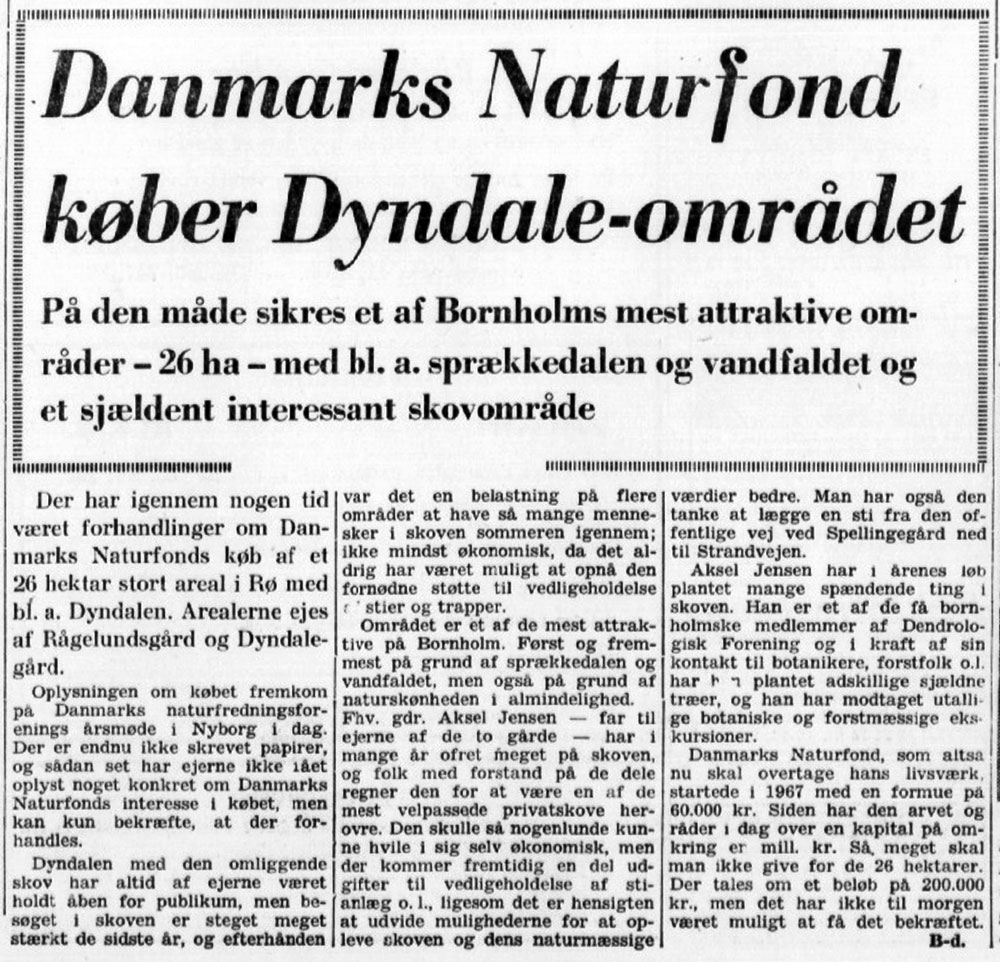 Nyheden om, at Danmarks Naturfond køber Døndalen i Bornholms Tidende 7. juni 1969