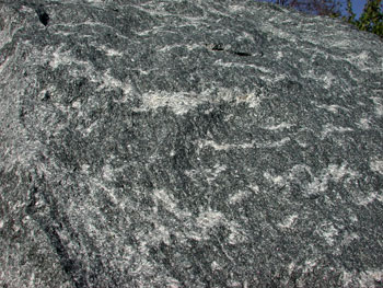 Kigger man på en frisk brudflade af granitten ser man de lyse og hårdere striber ligge som "vaskebrædt-agtige" bånd i den mørke grundmasse