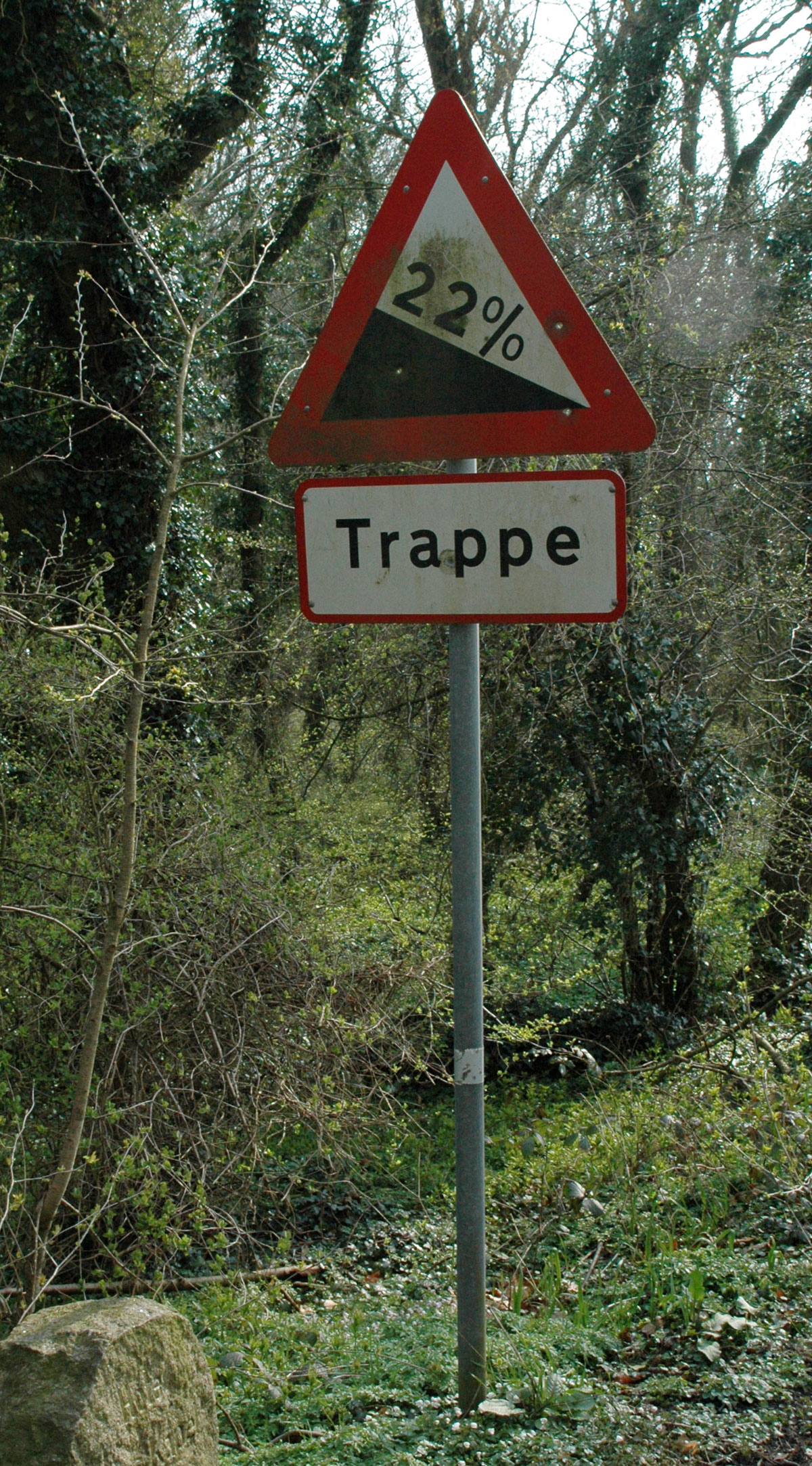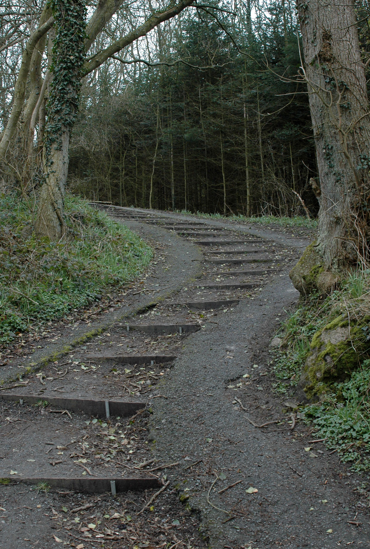 Cykelstien føger denne stigning, og cyklister må tage turen op ad skrænten gående på en trappe, der er bygget ind i cykelstien - vistnok landets eneste cykelstitrappe!