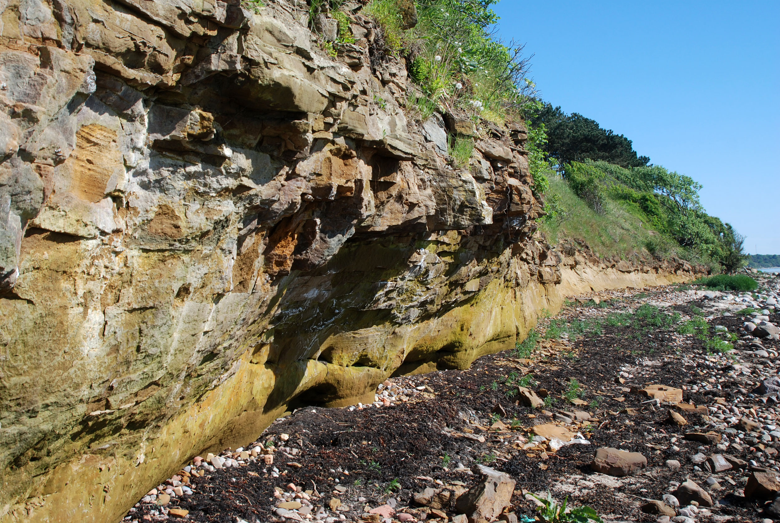 De løse sandstenslag er eroderet bort i tidens lange løb, men det hårde siltstenslag danner fortsat et undersøisk rev på lavt vand parallelt med kysten.